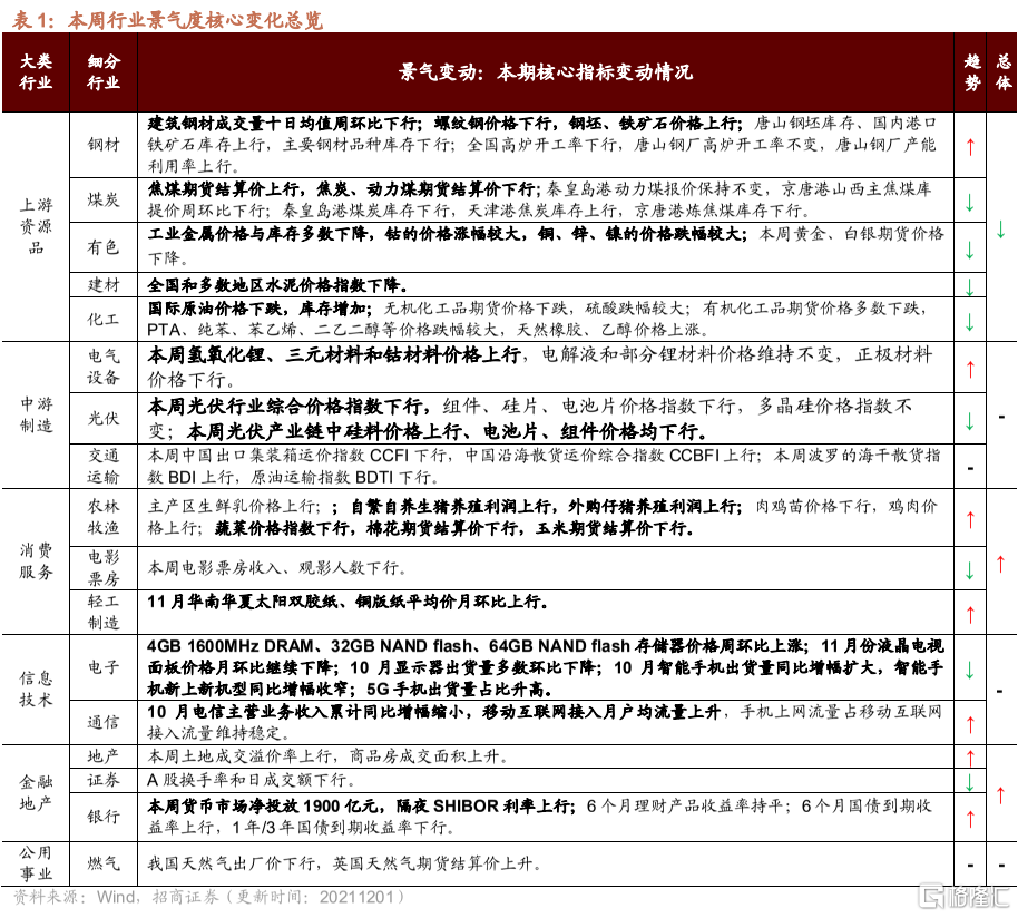TMT方面,存储器价格周环比上涨,11月液晶电视面板月环比下降,10月智能手机出货量同比增幅扩大,5G手机出货量占比提升。中游制造方面,本周氢氧化锂、三元材料和钴材料价格上行;光伏行业综合价格指数下行,组件、硅片、电池片价格指数下行。消费需求方面,主产区生鲜乳价格上行,自繁自养生猪养殖利润扩大,肉鸡苗价格下行,鸡肉价格上行,蔬菜价格指数下行,电影票房收入、观影人数周环比下行。资源品方面,建筑钢材成交量十日均值下行;螺纹钢价格下行,钢坯、铁矿石价格上行;焦煤期货结算价上行,焦炭、动力煤期货结算价下行;水泥价格指数下行;国际原油价格下跌,库存增加;无机化工品期货价格下跌;有机化工品期货价格多数下跌,PTA、纯苯、苯乙烯、二乙二醇等价格跌幅较大。工业金属价格与库存多数下降,钴的价格涨幅较大,铜、锌、镍的价格跌幅较大。黄金、白银期货价格下降。金融地产方面,货币市场净投放,隔夜SHIBOR利率下上行,土地成交溢价率上行。