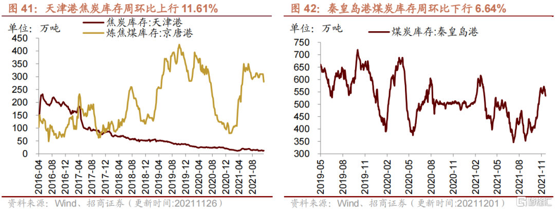 库存方面,本周秦皇岛港煤炭库存、京唐港炼焦煤库存周环比下行,天津港焦炭库存周环比上行。截至12月1日,秦皇岛港煤炭库存报534.00万吨,周环比下行6.64%;截至11月26日,京唐港炼焦煤库存报280.00万吨,周环比下行9.68%;天津港焦炭库存报12.50万吨,周环比上行11.61%。
