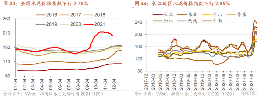 水泥价格方面,本周全国水泥价格指数下行,长江、东北、华北等多个地区水泥价格指数下行,西北水泥价格指数保持不变。截至11月29日,全国水泥价格指数为201.73点,周环比下行2.76%;长江地区水泥价格指数周环比下行2.95%至210.93点;东北地区水泥价格指数为185.51点,周环比下行5.16%;华北地区水泥价格指数为183.17点,周环比下行0.11%;华东地区水泥价格指数周环比下行2.61%至205.89点;西北地区水泥价格指数为175.84点,周环比保持不变;西南地区水泥价格指数周环比下行3.74%至195.95点;中南地区水泥价格指数为222.57点,周环比下行4.23%。