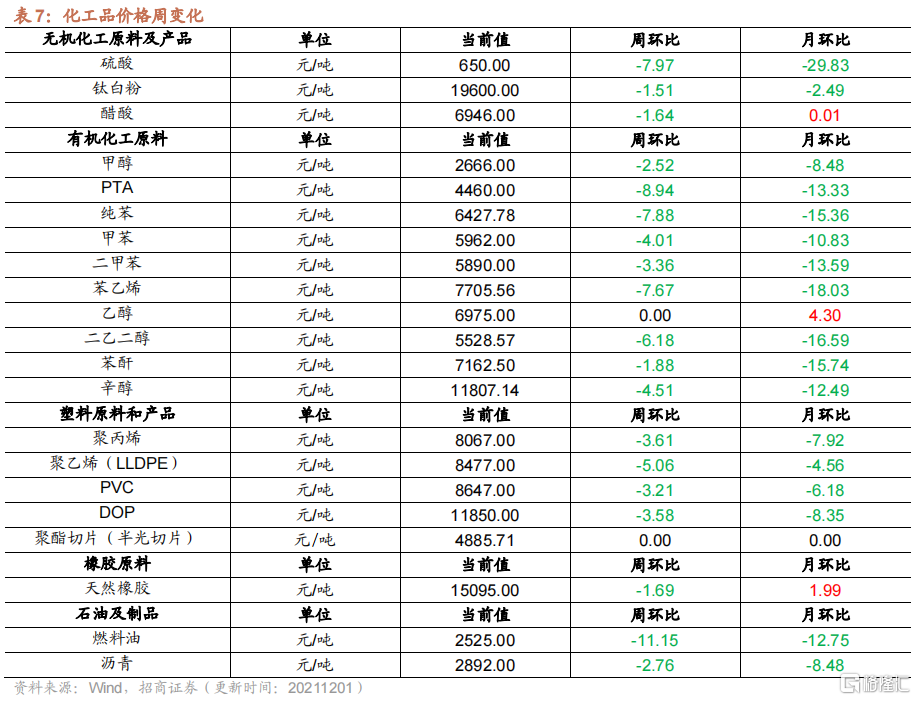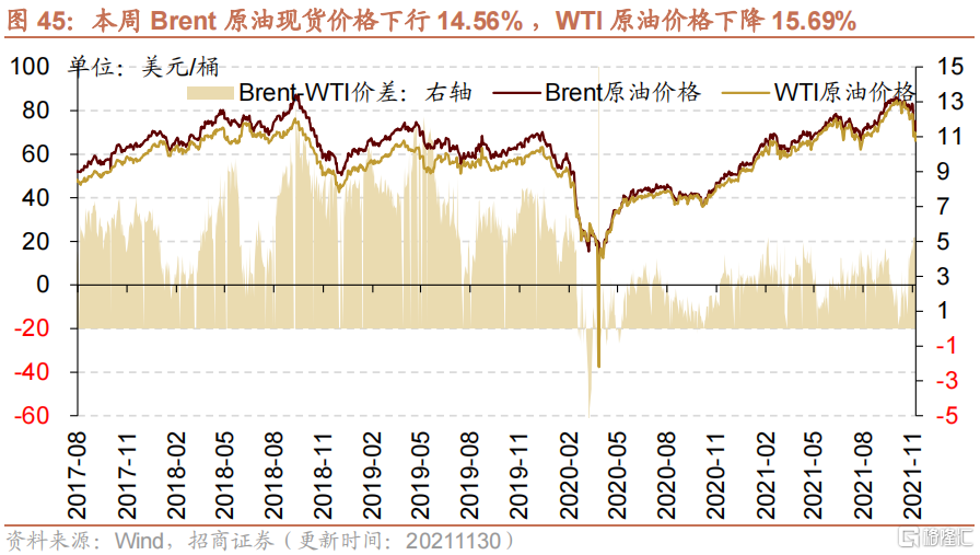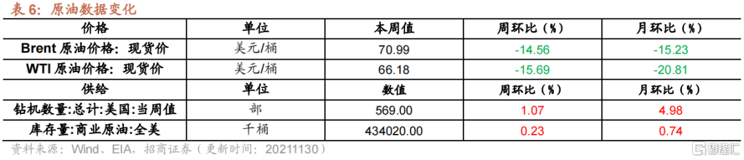 国际原油价格下跌,库存增加。截至2021年11月30日,Brent原油现货价格周环比下行14.56%至70.99美元/桶,WTI原油价格下行15.69%至66.18美元/桶。在供给方面,截至2021年11月24日,美国钻机数量当周值为569部,较上周增加6部;截至2021年11月19日,全美商业原油库存量周环比增加0.23%至4.34亿桶。