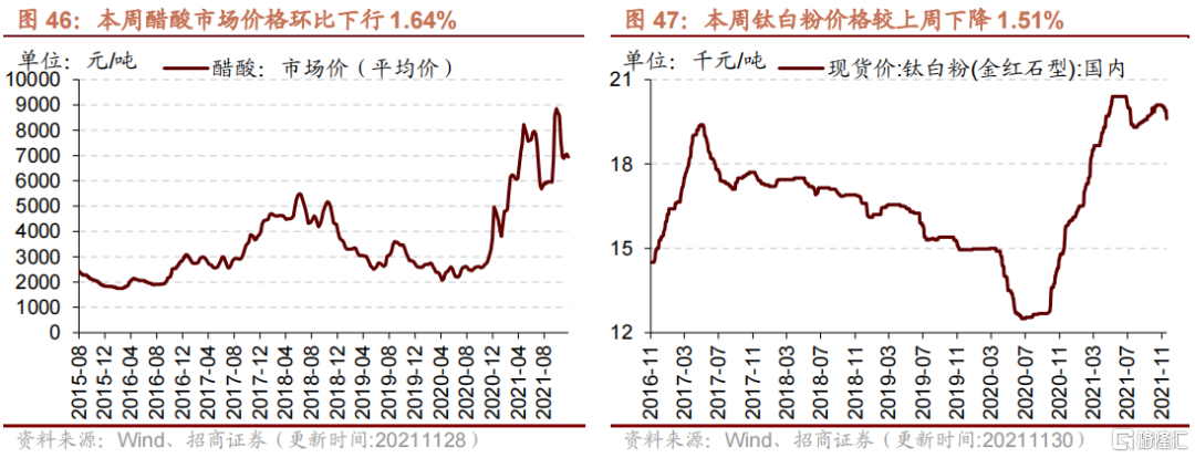 无机化工品期货价格多数下跌,硫酸跌幅较大。截至12月1日,钛白粉市场均价较上周下跌1.51%至19600.0元/吨。截至11月30日,纯碱期货结算价较上周下行4.2%至2735.0元/吨。截至11月28日,醋酸市场均价跌至6946.00元/吨,较上周下行1.64%;截至11月20日,全国硫酸市场均价周环比下降7.97%至650元/吨。
