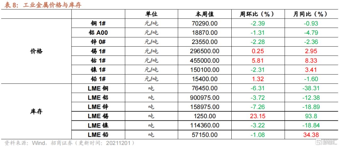 本周工业金属价格多数下降,库存涨跌多数减少,钴、铅、锡价格上涨,铜、锌、镍的价格跌幅较大;锡库存上行。截至12月1日,锡价格较上周上涨0.25%至296500.0元/吨;钴价格较上周上涨5.81%至455000.0元/吨;铅价格15400.0元/吨,周环比上行1.32%;铝价格周环比下行1.31%至18870.0元/吨;铜价格70290.0元/吨,周环比下行2.39%;长江有色市场锌价格为23550.0元/吨,周环比下行2.28%;长江有色金属镍价格周环比下行2.31%至150100.0元/吨。