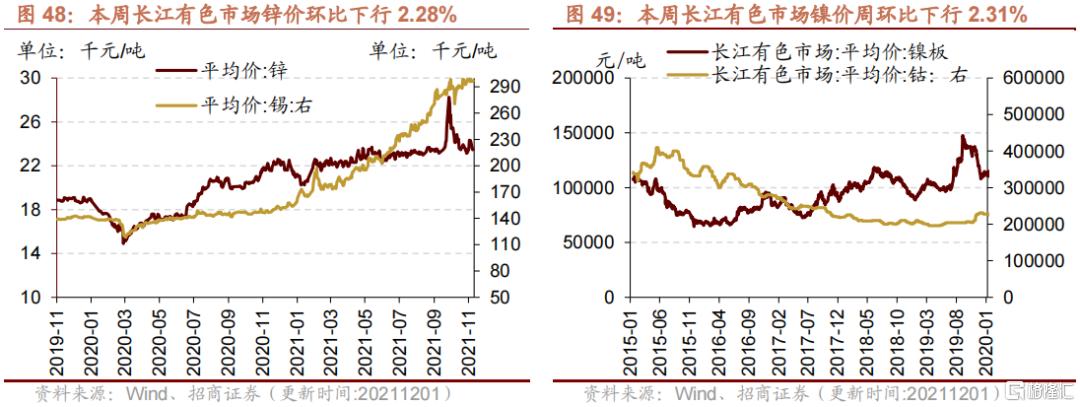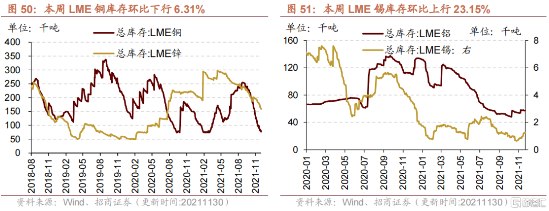 库存方面,截至11月30日,LME锡库存周环比上行23.15%至1250.0吨;LME铅库存本周下行1.08%至57150.0吨;LME锌库存本周下行7.26%至158975.0吨;LME铝库存较上周下行3.72%至900975.0吨;LME铜库存较上周下行6.31%至76450.0吨;LME镍库存114360.0吨,较上周下行3.22%。