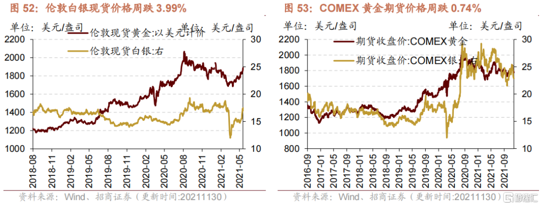 本周黄金、白银现货价格涨跌互现。截至11月30日,伦敦黄金现货价格为1804.40美元/盎司,周环比上行0.85%;伦敦白银现货价格收于22.87美元/盎司,较上周下行3.99%;COMEX黄金期货收盘价报1776.20美元/盎司,较上周下行0.74%;COMEX白银期货收盘价下行3.34%至22.87美元/盎司。