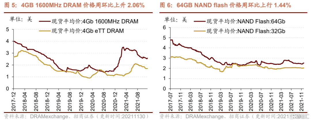 4GB 1600MHz DRAM、32GB NAND flash、64GB NAND flash存储器价格周环比上涨。截至11月30日,4GB 1600MHz DRAM价格周环比上升2.06%至2.573美元;32GB NAND flash价格周环比上行0.94%至2.042美元;64GB NAND flash价格周环比上行1.44%至2.534美元。