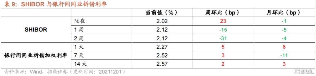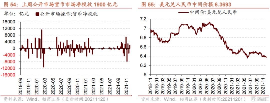 本周货币市场净投放1900亿元,隔夜SHIBOR利率上行。截至12月1日,隔夜SHIBOR较上周上行23bps至2.02%,1周SHIBOR较上周下行15bps至2.12%,2周SHIBOR较上周下行31bps至2.12%。截至11月30日,1天银行间同业拆借利率较上周上行5bps至2.27%,7天银行间同业拆借利率较上周上行3bps至2.52%,14天银行间同业拆借利率上行2bps至2.57%。在货币市场方面,截至11月26日,上周货币市场投放4000亿元,货币市场回笼2100亿元,货币市场净投放1900亿元。在汇率方面,截至12月1日,美元兑人民币中间价报6.3693,较上周下跌0.02。