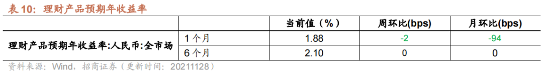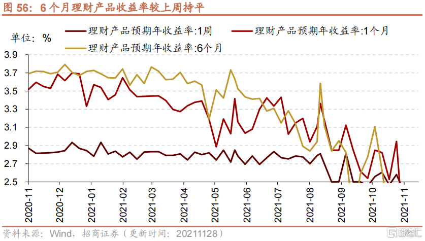 6个月理财产品收益率较上周持平。截至11月28日, 6个月理财产品预期收益率为2.10%,较上周持平。