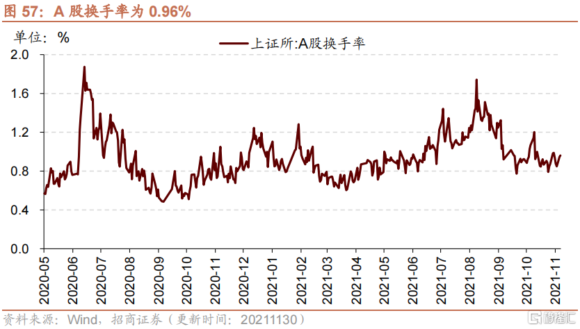 A股换手率和日成交额下行。截至11月30日,上证A股换手率为0.96%,较上周下行0.03个百分比;沪深两市日总成交额下行,两市日成交总额为11610.83亿元人民币,较上周下行0.6%。