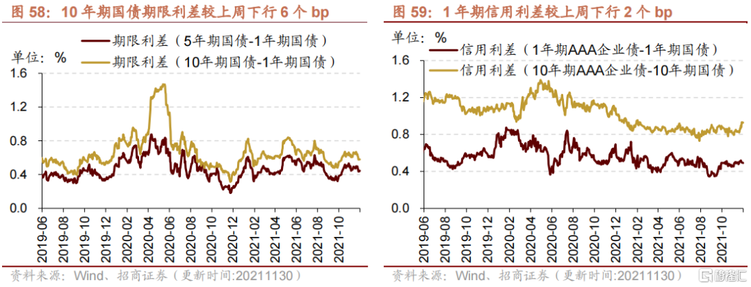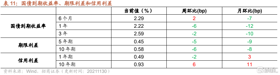 在债券收益率方面,6个月国债到期收益率上行,1年/3年国债到期收益率下行。截至11月30日,6个月国债到期收益率较上周上行2bp至2.29%;1年国债到期收益率较上周下行6bp至2.22%,3年期国债到期收益率较上周下行2bp至2.59%。5年期债券期限利差较上周下降5bp至0.45%;10年期债券期限利差较上周下降6bp至0.58%;1年期AAA债券信用利差较上周下行2bp至0.49%;10年期AAA级债券信用利差上行6bp至0.93%。