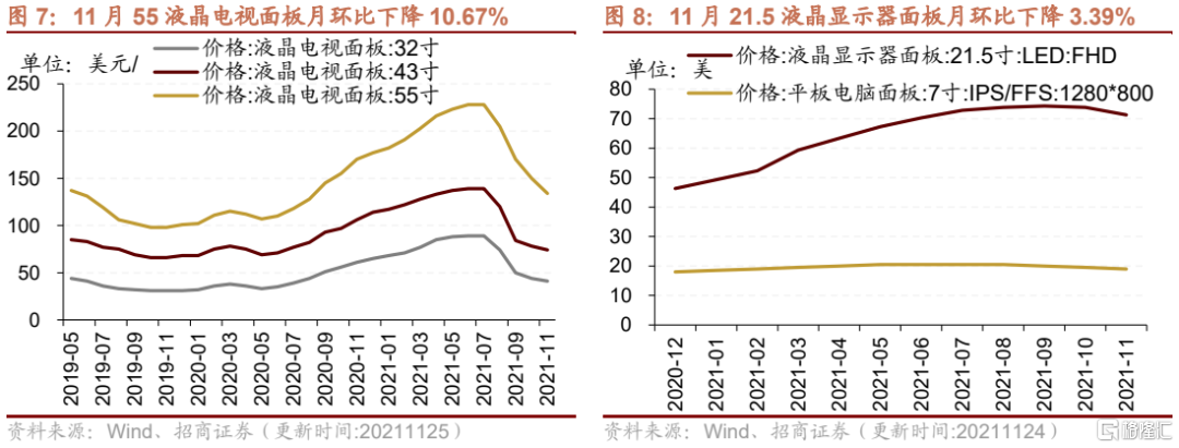 11月液晶电视面板月环比下降。液晶电视面板方面,11月32寸液晶电视面板价格较上月跌6.82%至41美元/片;43寸液晶电视面板价格较上月跌5.13%至74美元/片;55寸液晶电视面板价格较上月跌10.67%至134美元/片;液晶显示器面板月环比下降,截至11月24日,21.5寸液晶显示器面板价格为71.30美元,月环比下降3.39%;7寸平板电脑面板价格为19美元,较上月下降2.56%;截至11月30日,23.8寸液晶显示器面板价格82.4美元/片,与上月持平。