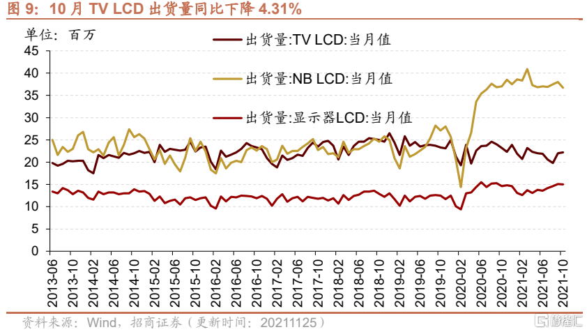 10月显示器出货量多数环比下降。10月TV LCD出货量为22.2百万,同比下跌4.31%,环比上升0.91%;NB LCD出货量为36.7百万,同比下降0.81%,环比下降3.42%;显示器LCD出货量为15百万个,同比上升2.74%,环比下降0.66%。