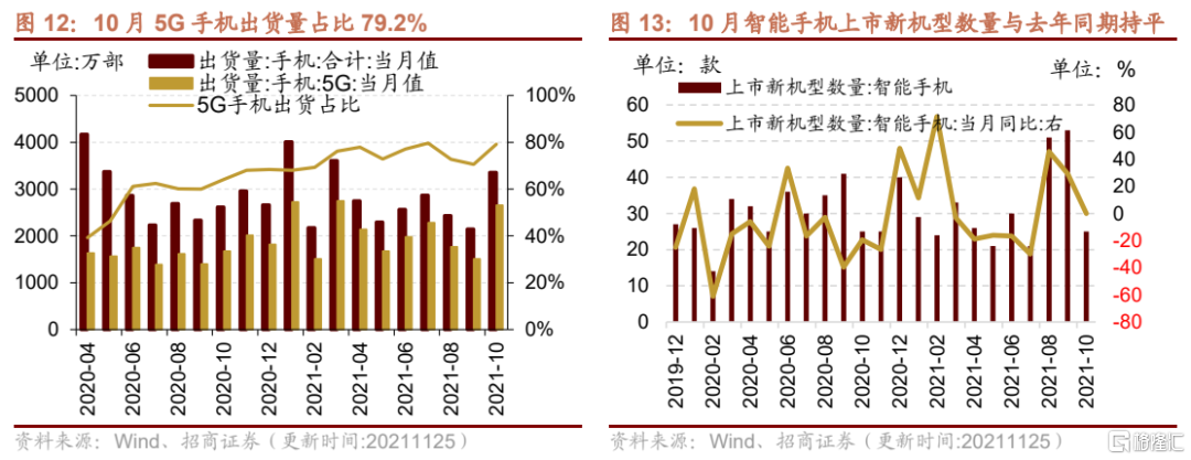 4、10月智能手机上市新机型数量同比增幅收窄,5G手机出货量占比提升