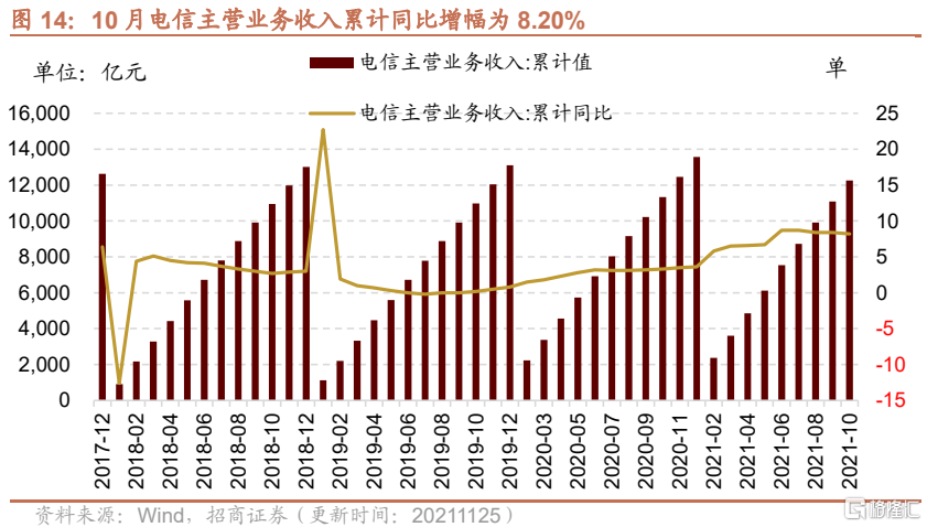 1-10月电信主营业务收入累计同比增幅收窄。1-10月电信主营业务收入累计12252亿元,累计同比增幅为8.20%,较上月收窄0.2个百分点。