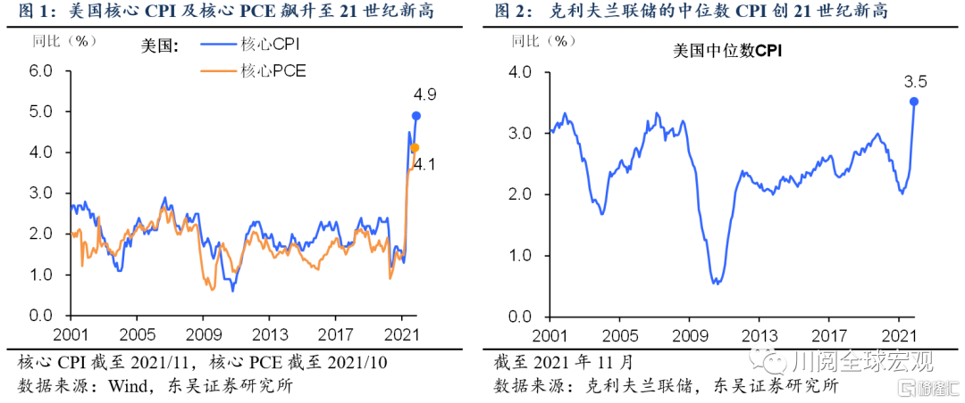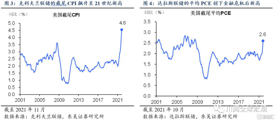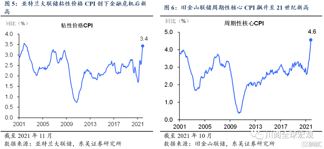 多指标观测下,2021年四季度美国通胀飙升程度普遍升级(图1-图6)。我们在此前的报告中介绍了四类反映美国潜在通胀走势的指标,其中剔除了异常波动项的截尾平均PCE(达拉斯联储)、剔除了反周期性影响的粘性价格CPI(亚特兰大联储)以及衡量通胀中枢的中位数CPI(克利夫兰联储),在9月还仅仅是恢复到疫情前水平,在10月便创金融危机以来的新高。