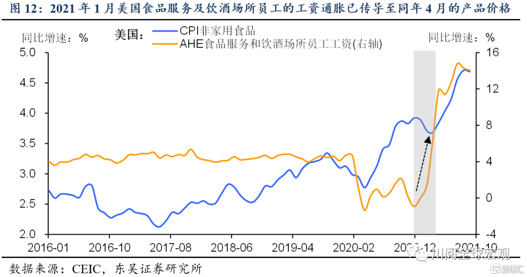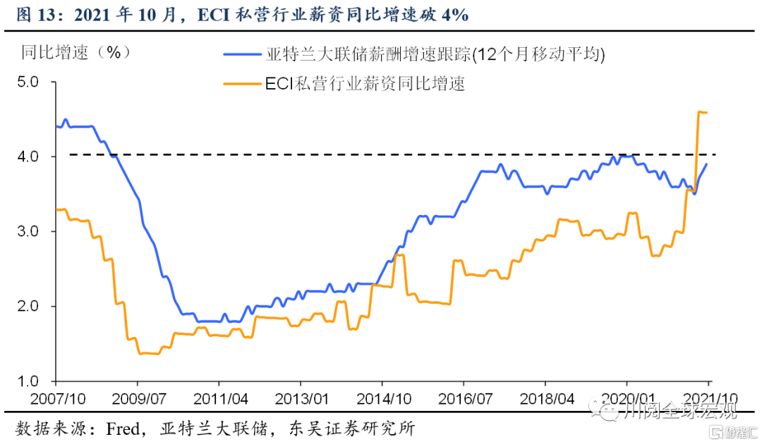 此外,部分行业的薪资通胀已经传导至产品价格(图12)。我们此前报告指出,疫情造成劳动力市场扭曲,劳动参与率结构性下降,部分临近退休年龄的人员提前退休、美国劳动力的主要增量之一移民数量的骤减等因素下,就业市场供给紧俏迟迟得不到缓解。企业为了吸引并留住员工频频涨薪,2021年10月,ECI私营行业薪资同比增速破4%(图13)。