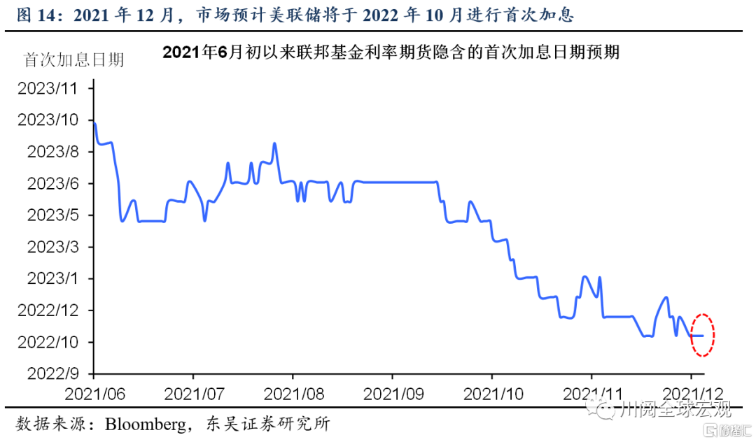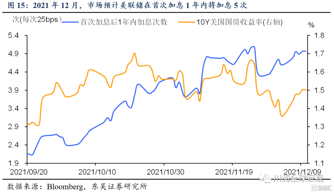 供应短缺延续和薪资增速破4%等因素迫使美联储正视通胀非暂时性的现实。会议纪要显示美联储官员在11月的议息会议上已经讨论了加速taper,为后续的加息留出空间。我们预计taper的缩减量可能翻倍至300亿美元/月,并于2022年一季度末结束。加息方面,市场的预测可以用“转弯慢但是转得急”来概括,2021年12月,市场预测首次加息时点为2022年10月、在首次加息后一年内加息5次(图14-图15)。