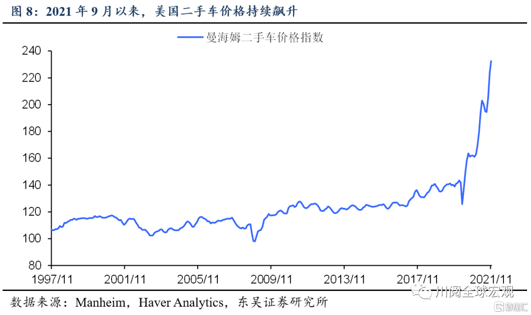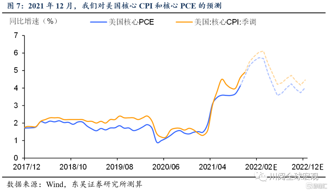 那么,后续美国通胀将如何演绎?根据我们的预测,核心CPI可能于2022年3月见顶,达到近6.1%,核心PCE可能于2022年2月见顶,达到近5.7%(图7)。