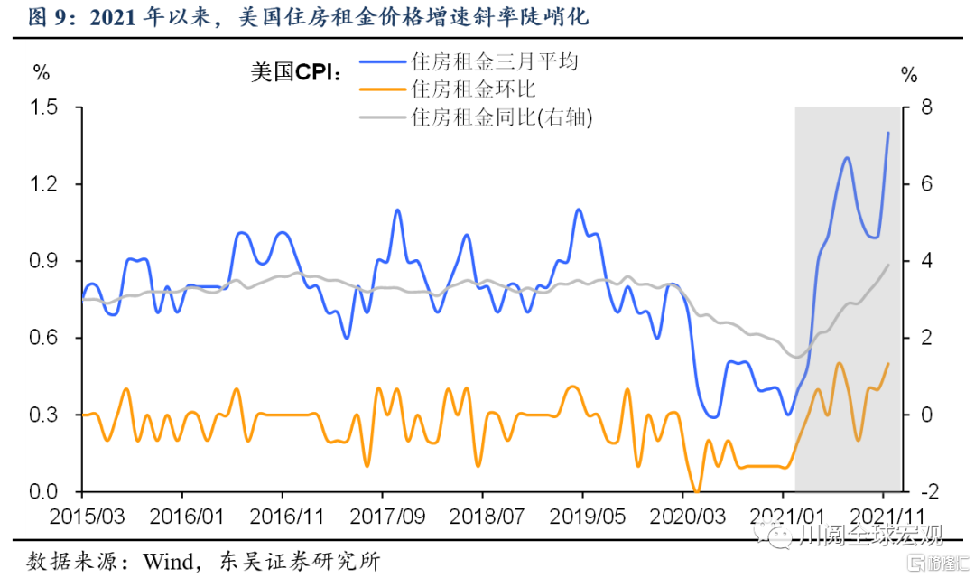 从分项的维度来分析,2021年11月,通胀的两大主要推手房租和二手车价格飙升动能不减。芯片短缺制约下,美国机动车及零部件制造业产能利用率仍滞后于疫情前水平,造成9月以来二手车价格跳升(图8)。房租价格方面,其同比增速已经从2月的1.5%飙升至11月的3.9%(图9),根据我们对于历史数据的分析,标普美国房价指数作为房租的先行指标,约领先房租15个月,我们预计在2022年一季度仍将推升美国通胀。