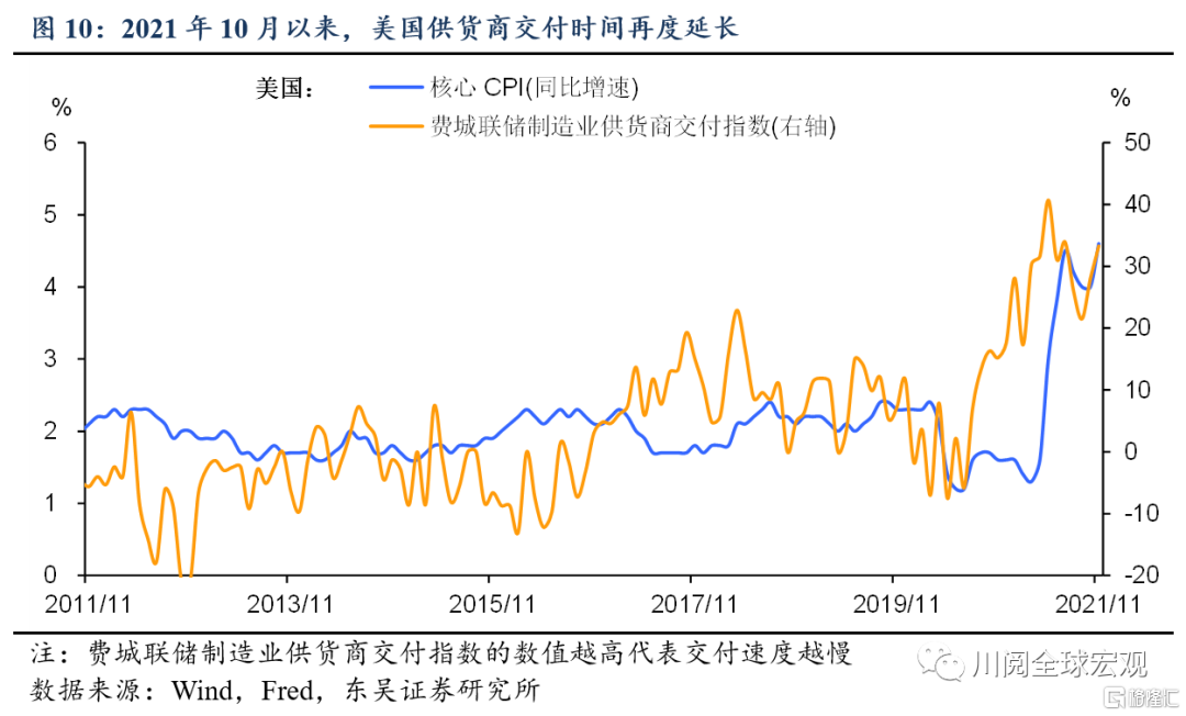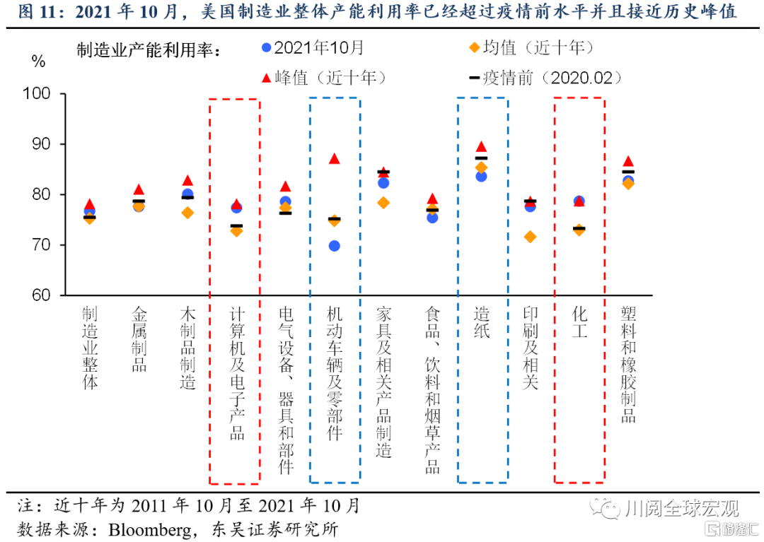 从供需错配的维度来看,美国经济复苏下需求端强势回暖,部分领域的供应短缺可能要延续至2022年中。美国供货商交付时间于2021年5月见顶回落后于10月起再度回升(图10)。而10月美国制造业整体产能利用率已经超过疫情前水平,并且计算机及电子产品、化工行业产能利用率已经处于历史峰值(图11)。鉴于产能投放周期较长,供不应求可能在2022年一二季度进一步推升相关产品价格。