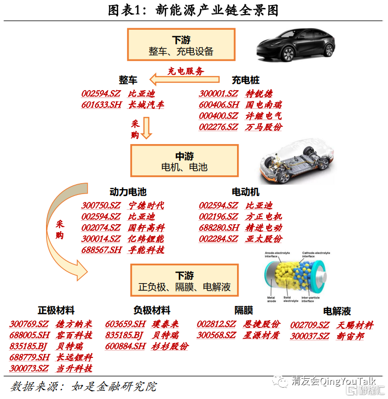 在观察对象的选取上,我们从上游、中游到下游对整个新能源产业链进行梳理,并纳入氢燃料电池等热门赛道进行分析。从产业链划分上,我们将新能源产业链划分为四大部分:分别为下游,即新能源整车(EV、PHEV)与相关充电设备;中游,即新能源电动车所使用的动力锂离子电池与电动机;上游,即组成动力锂电池的正极材料、负极材料、隔膜与电解液。此外,我们纳入了氢燃料电池与滑板底盘两大热门板块的梳理。