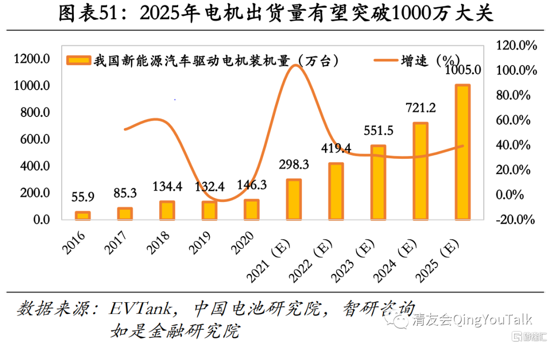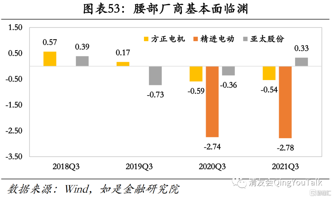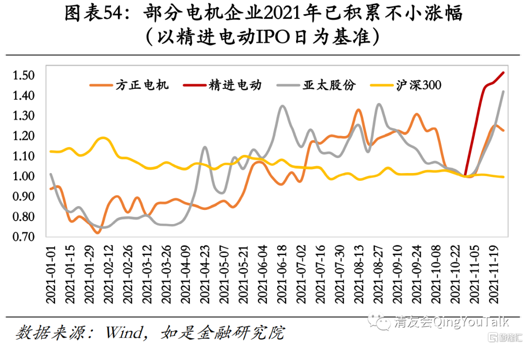 赛道总量增速仍在,但头部车企自造电机趋势下非头部厂商基本面临渊,警惕市场份额挤出风险。从市场总量层面看,新能源汽车增长红利叠加“双电四驱”释放电机需求,助推行业整体基本面改善。当前新能源汽车市场份额A级(紧凑型车)>B级(中型车)>A00级(微型车)>A0级(小型车)>C级(中大型车),由于B级(中型车)增长势头迅猛,带动“双电机+四驱”成为主流配置,电机翻倍需求有望助推电机市场高景气度。但从结构上看,虽然电机总量市场有较大扩张潜力,但市场份额主要由比亚迪、特斯拉、蔚来等头部企业旗下自造电机所占领。根据EVTank统计与预测数据,2020年中国新能源汽车驱动电机的市场规模约为74.64亿元,若根据2020年市场格局测算,方正电机与精进电动对应理论市场份额上限分别为5.00亿、2.54亿,腰、尾部电机企业空间不大,基本面临渊。同时受益于市场对于新能源汽车产业链高涨情绪,2021年内相关标的已经累积了不小涨幅,腰、尾部电机企业行情回调风险值得关注。