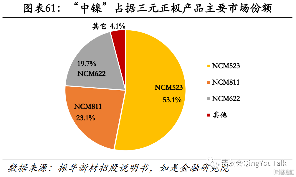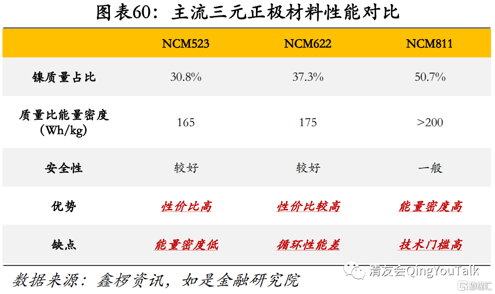 根据镍、钴、锰三种元素占比,当前市场常见三元正极可划分为NCM523、NCM622、NCM811等类型(其中后三位数字分别代表镍(N)、钴(C)、锰(M)三种元素占比,比如NCM523镍、钴、锰三种元素比例为5:3:2)。NCM523其镍元素质量占比为30.8%,顾称之为“中镍三元”,同理NCM622、NCM811镍含量分别为37.3%、50.7%,可成为“中高镍三元”与“高镍三元”。由于镍、钴、锰三种元素质量占比各不相同,上述类型三元正极材料所呈现性能也各有优劣。例如NCM523能量密度较低,但整体性价比较高;NCM811能量密度优势明显,但工艺门槛更高,制造难度更大。因此从市场份额来看,综合性价比更高的NCM523市场占比更大。根据鑫椤资讯数据,2020年NCM523、NCM622、NCM811所对应三元正极市场份额分别为53%、20%、22%。