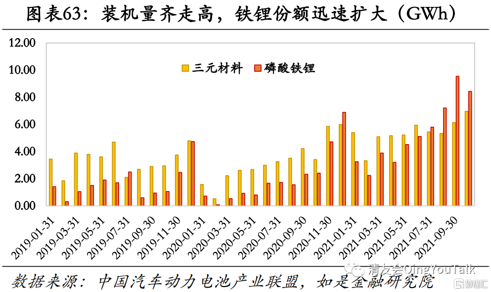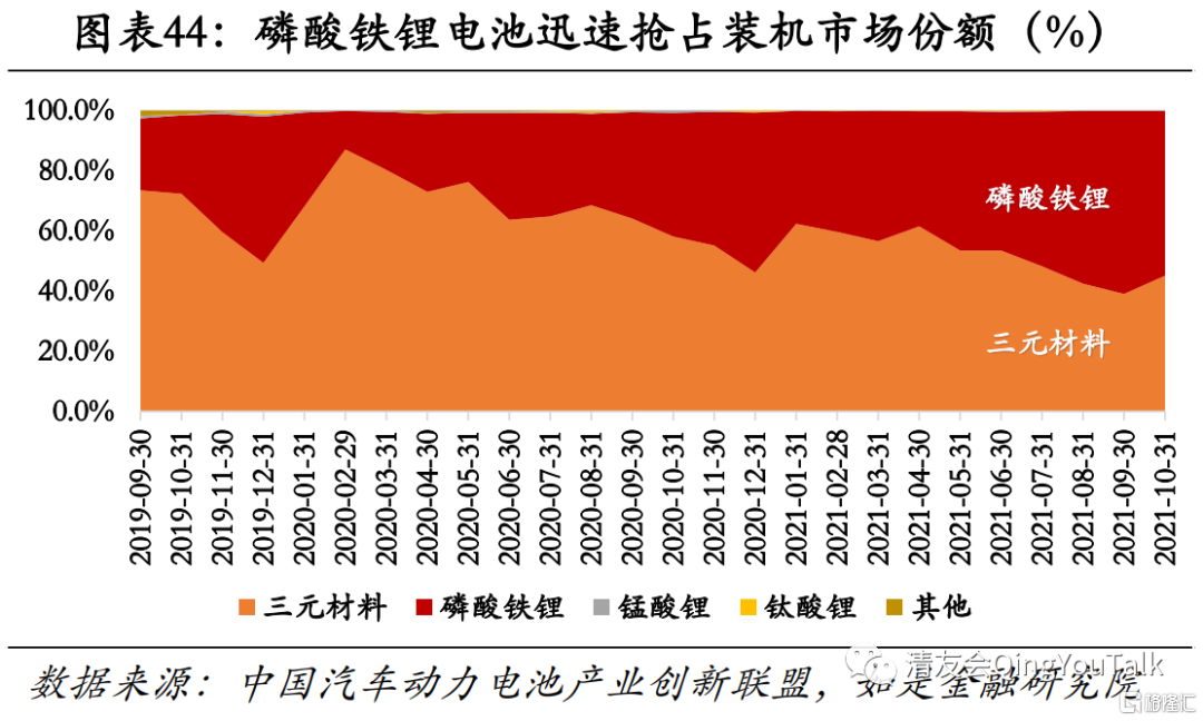 A00级车拉动磷酸铁锂,中、高端车拉动三元材料,二者实现差异化竞争,市场份额博弈还将持续。从市场份额总量来看,三元材料正极电池和磷酸铁锂正极电池占据市场几乎全部份额,根据中国汽车动力电池产业联盟数据,2021年1-10月三元材料正极电池和磷酸铁锂正极电池装车辆分别达到54.05GWh和53.21GWh,与去年同期(前十月)相比分别增长100.1% 和316.4%,增速均十分迅猛。同时磷酸铁锂表现更佳,市场份额迅速提高,(三元材料正极电池/磷酸铁锂正极电池)装机量之比从去年同期的2.11降至今年的1.02。我们对此现象的解释是,中镍三元常用于A级车,高镍三元常用于中B级与C级,而磷酸铁锂主要应用于A00级等微型车,这一点通过对比三元市场占比与C级新能源车市场占比,磷酸铁锂市场占比与A00级车市场占比也可以印证,三元市场占比与C级市场占比高度相关,磷酸铁锂市场占比与A00级车市场占比同样高度相关。因此磷酸铁锂电池受益于微型车成为电动车市场主力叠加比亚迪刀片电池放量,整体景气度明显上升,迅速抢占市场份额。但本质上三元材料正极电池与磷酸铁锂正极电池二者目标用户重叠性仍不高,二者市场实现错位发展,因此未来两者装机量齐高还将持续。