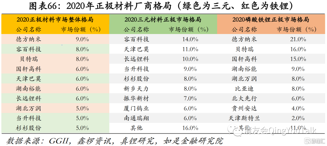 正极头部继续聚拢,关注宁德时代供应链。从竞争格局来看,三元正极、磷酸铁锂正极市场份额均继续向头部靠拢。根据GGII,鑫椤资讯,真锂研究等多方数据汇总,2020年正极材料市场份额前十厂商分别为德方纳米(磷酸铁锂,9%)、容百科技(三元材料,8%)、贝特瑞(磷酸铁锂,8%)、国轩高科(磷酸铁锂,6%)、天津巴莫(三元材料,6%)、湖南裕能(磷酸铁锂,6%)、长远锂科(三元材料,6%)、湖北万润(磷酸铁锂,5%)、当升科技(三元材料,5%)、杉杉股份(三元材料,5%),CR10达64%。由于动力电池头部效应明显,根据中国汽车动力电池产业创新联盟、GGII等机构数据汇总整理,2020年动力锂电池厂商市场集中度CR3、CR5、CR10分别为74%、84%、93%,宁德时代(2021H全球市场份额达29.9%)、比亚迪等头部厂商供应链企业值得关注。