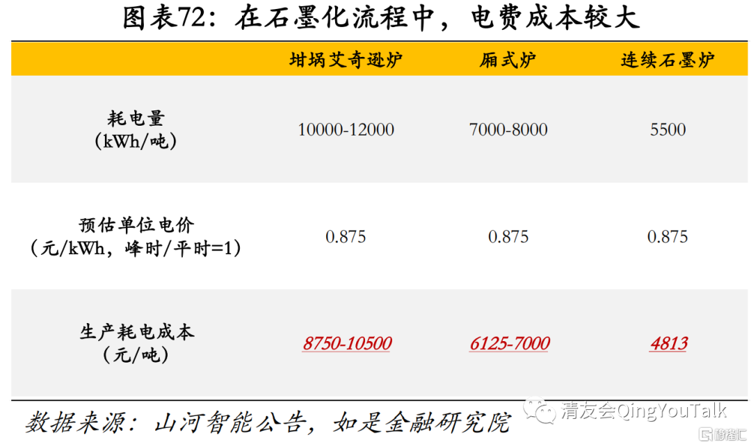 石墨化在制造流程中占比最大,电价石墨化主要成本,经测算生产每吨人造石墨负极耗电成本高达8750-10500元。传统人造石墨工艺总计分为四部:一是预处理——即根据产品的不同,将石墨原料与沥青按不同比例混合,放入空气流磨中进行气流磨粉,将5~10mm粒径的原辅料磨至5-10微米。二是造粒——即将中间投入反应釜中,按照温度曲线进行电加热,后反应釜中挥发气由风机抽出,经冷凝罐冷凝,液态以焦油状凝结,气态废气由风机引出,经活性炭过滤后排空。三是石墨化——将造粒处理的物料进行石墨化处理,通常本步骤采取外包模式,是整个生产流程中主要成本。四是球磨筛分——石墨化后的物料通过真空输送到球磨机,进行物理混合、球磨,使用270目的分子筛进行筛分,筛下物进行检验、计量、包装入库。人造石墨负极材料传统制造业属性重,成本主要在上游人力成本与电费,根据山河智能公吿,坩埚艾奇逊炉、厢式炉和连续石墨炉的耗电约为10000-12000kWh/吨、7000-8000kWh/吨和5500kWh/吨,当前工业电费峰时段用电1.025元/kWh、平时段用电0.725元/kWh、谷时段用电0.425元/kWh,若以峰时、平时、谷时比例为1:1:0计算,齐对应生产过程耗电成本分别为8750-10500元/吨、6125-7000元/吨、4813元/万吨。若以年化产能为1万吨计算,则每年企业为制备人工石墨所花费纯电费成本约为8750万到10500万元。