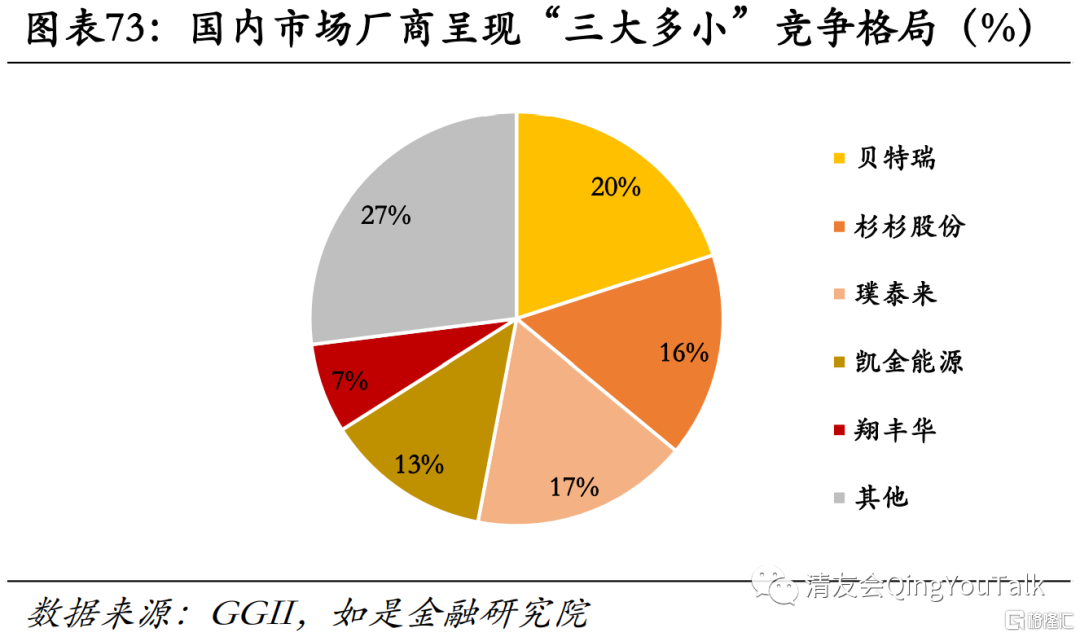 国内企业规模“出海”,厂商竞争态势仍在。从国内市场格局来看,根据GGII披露数据,2020年国内动力锂电池负极材料市场份额前五名企业分别为贝特瑞(中国市场份额20%)、杉杉股份(16%)、璞泰来(17%)、凯金能源(13%)、翔丰华(7%),国内市场厂商呈现“三大多小”竞争格局,CR5为73%。从全球市场看,中国企业占据全球动力电池负极市场绝大部分份额,根据GGII数据2020年全球动力锂电池负极材料市场份额前五名为璞泰来(全球市场份额12%)、贝特瑞(10%)、杉杉股份(10%)、凯金能源(7%)、浦项(5%),中国企业规模“出海”,抢占全球份额。由于负极材料尚未进入技术革新周期,参与壁垒主要为生产资本,技术壁垒相较于正极材料与产业链下游动力锂电池等赛道较低,因此厂商竞争态势仍在。