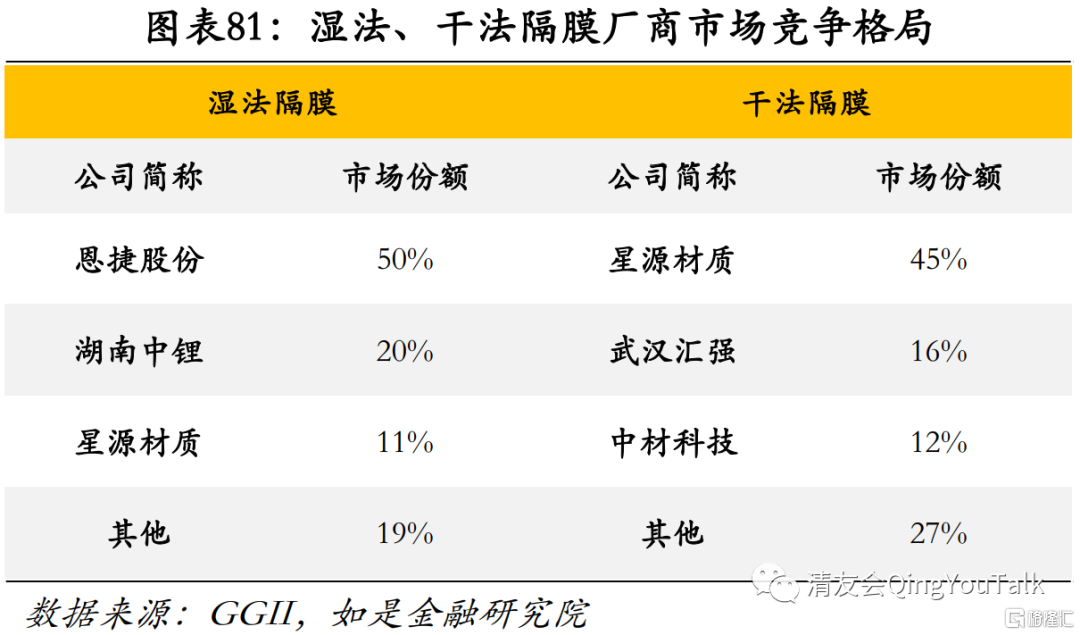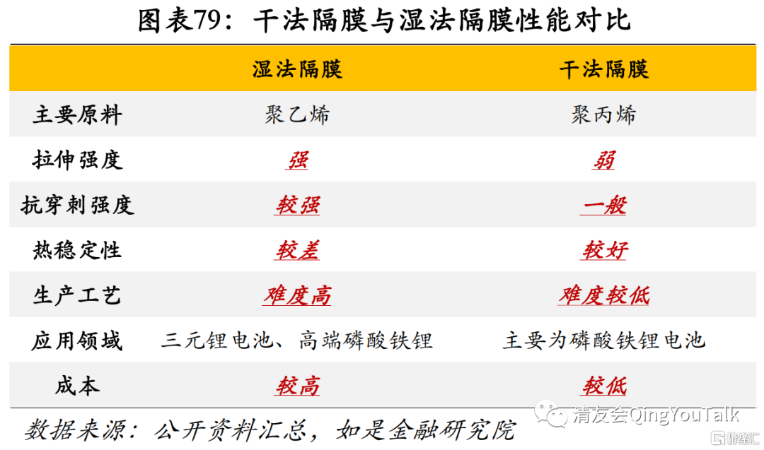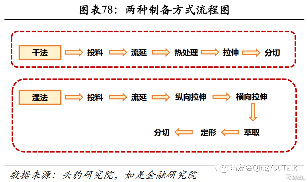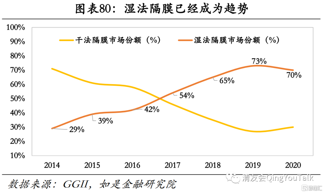 配合高镍三元锂电路径,湿法隔膜厂商有望迎来二次增长。锂电池隔膜一般按照工艺,分为干法工艺和湿法工艺。干法隔膜即通过生产硬弹性纤维的方法,制备出低结晶度的高取向聚丙烯或聚乙烯薄膜,在高温退火过程中,获得高结晶度的薄膜;湿法隔膜即将液态烃或一些小分子物质与聚烯烃树脂混合,加热熔融后,形成均匀的混合物,然后降温进行相分离,压制得膜片,再将膜片加热至接近熔点温度,进行双向拉伸使分子链取向,最后保温一定时间,用易挥发物质洗脱残留的溶剂,可制备出相互贯通的微孔膜材料。在物理性能和机械性能方面干法单向拉伸工艺生产的隔膜更具有优势,但采用湿法生产工艺生产出来的锂电池隔膜具有较高的孔隙率和良好的透气性,可以满足动力电池的大电流充放的要求,性能更加。目前动力电池中的磷酸铁锂电池大多使用干法隔膜,而三元锂电池大多使用湿法隔膜,目前三元电池装机量增加带来的湿法隔膜需求不断增大,同时磷酸铁锂正在升级,高端磷酸铁锂电池已经有干法隔膜转向为湿法隔的趋势,总体来看性能相对较好的湿法隔膜将更有可能成为主流技术路径。