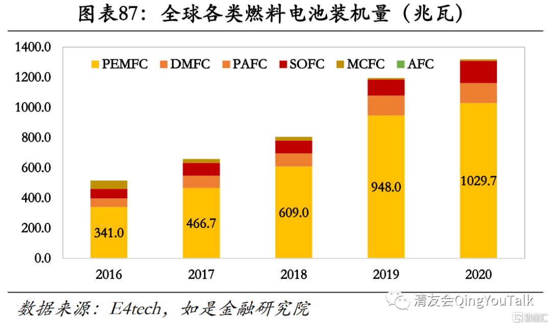 PEMFC受益于氢车市场,装机量在各类电池中占据主导地位。质子交换膜燃料电池(PEMFC)指使用水基的酸性聚合物膜作为其电解质,具有铂基电极的燃料电池解决方案。PEMFC电池可以在相对低的温度下操作并且可以定制电输出以满足动态功率需求,因此是当前燃料电池汽车所最常用的电池解决方案。其主要优势比较明显:发电反应启动快、对使用工况要求比较低(不需要极端高温)、可直接用空气作为氧化剂(不需要单独加入纯氧)。根据ERM集团旗下网站E4tech发布的《燃料电池行业回顾2020》,2020年全球各类燃料电池装机量达1318.7兆瓦。其中PEMFC、DMFC、PAFC、SOFC、MCFC、AFC六大类电池装机量市场份额分别为1029.7、0.4、132.2、147.5、8.8、0.1,对应市场份额分别为78.1%、0.1%、10.0%、11.2%、0.7%、0.1%。其中PEMFC受益于氢车市场,装机量市场规模占比高达78.1%,并迅速从2016年341.0兆瓦增长至2020年1029.7兆瓦。