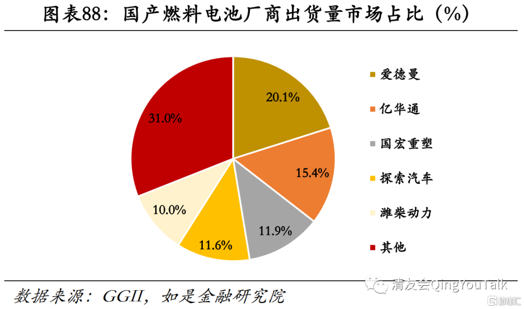 国内燃料电池出货量增长较快,但受制于氢能车需求小,燃料电池市场整体规模不大。根据GGII发布的《燃料电池汽车月度数据库》统计数据显示,2020年我国氢燃料电池系统装机量约为79.2MW,同比下降37%。其中,氢燃料电池系统在客车上的合计装机量约为71.7MW,同比增长46%。当前我国国产燃料电池市场份额前五大厂商分别为爱德曼、亿华通、国宏重塑、探索汽车、潍柴动力,出货量市场份额占比分别为20.1%、15.4%、11.9%、11.6%、10.0%,其他厂商出货量市场份额占比31.0%。