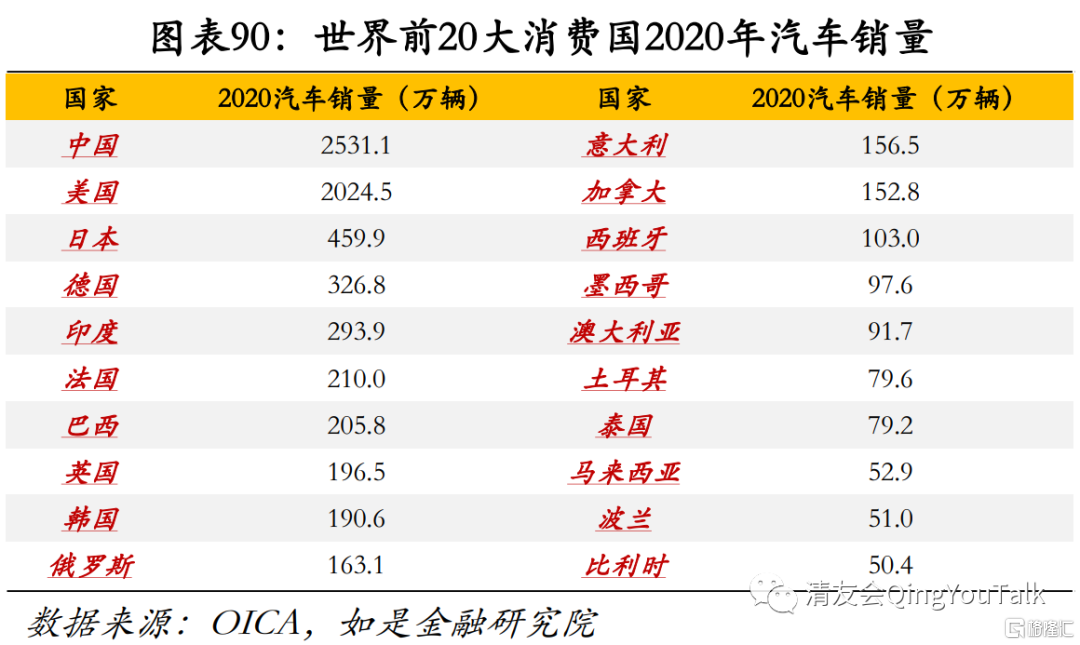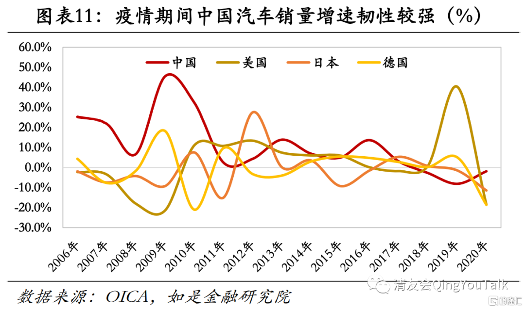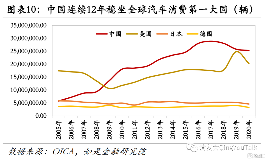 中国是世界第一大汽车消费国,全品类汽车销量超2500万辆。中国自2009年全年汽车总销量超过美国后,已经连续12年成为全球第一大汽车市场。根据国际汽车制造协会(OICA)统计,在疫情之下的2020年中国汽车销售超2500万辆,稳居世界第一。2020年汽车前五大销售国分别为:中国(2531万辆)、美国(2024万辆)、日本(459万辆)、德国(326万辆)、印度(293万辆),中国汽车年销量已超位列第二名的美国与第三名的日本之和。高总量的同时,一方面在主要汽车市场(中美日德),仅有中、美两国市场还在扩张,另一方面根据国际汽车制造协会(OICA)数据,2011年以来,中国、美国、日本、德国四大汽车市场销量分别增长36.78%、55.25%、9.22%、-6.85%。特别是疫情发生后,各大汽车市场均受到打击。2020年中、美、日、德四国全年销量较前一年销量分别减少1.9%、18.5%、11.5%、18.6%。中国由于市场整体韧性较强、疫情管控情况较好,汽车销量受到影响相较于其他国家更小。
