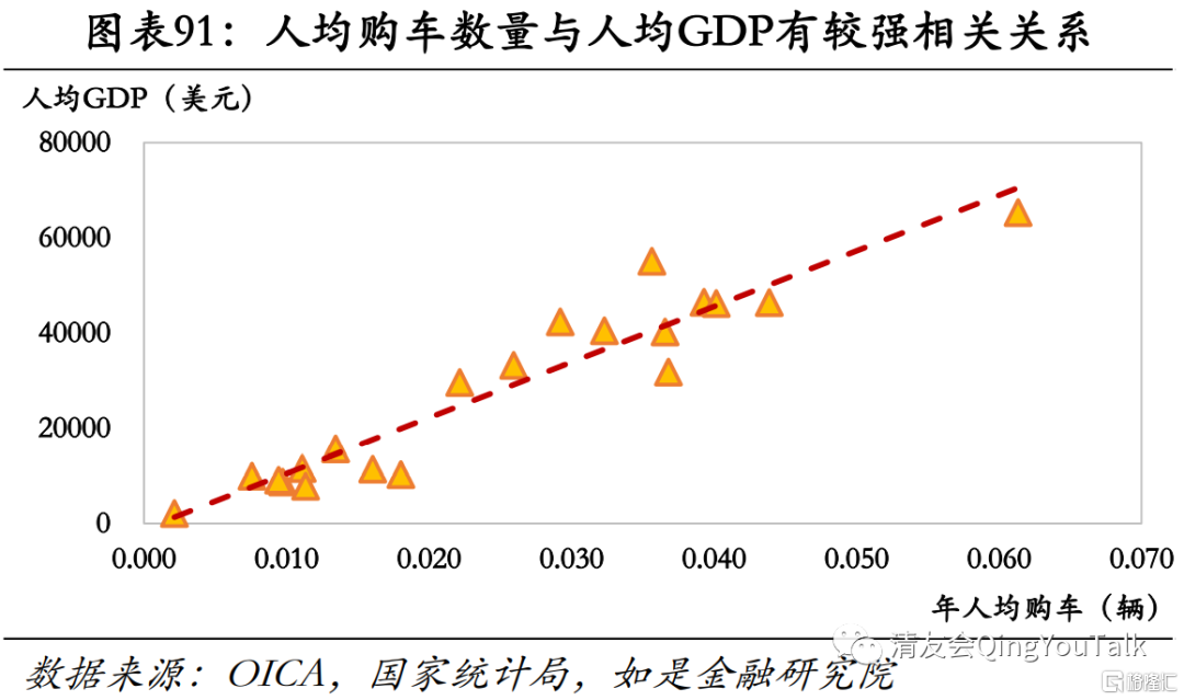 内需倍增背景下中国汽车市场长期仍有增长潜力。随着人均GDP水平的提升,到2035年中国汽车市场总规模从理论上说仍有一定发展空间。汽车作为一类与人均收入水平和边际消费倾向直接挂钩的高额消费品,其行业景气度和国家经济运行情况高度相关。在基础设施建设、汽车购买政策等方面处于同等水平的前提下,乘用车销量与人均GDP呈现出高度正相关关系。根据世界银行与国际汽车制造协会(OICA)数据,我们可以对世界前二十大汽车消费国2019年人均购置车辆数目和各国人均GDP进行回归分析,二者具有较强线性关系,可近似视为正比例关系。