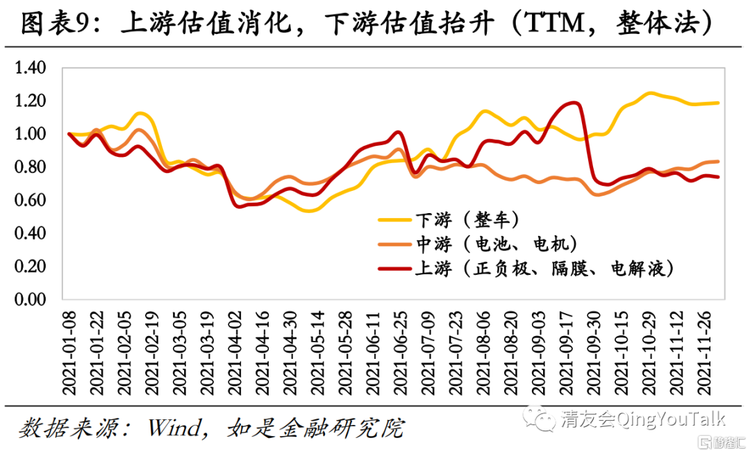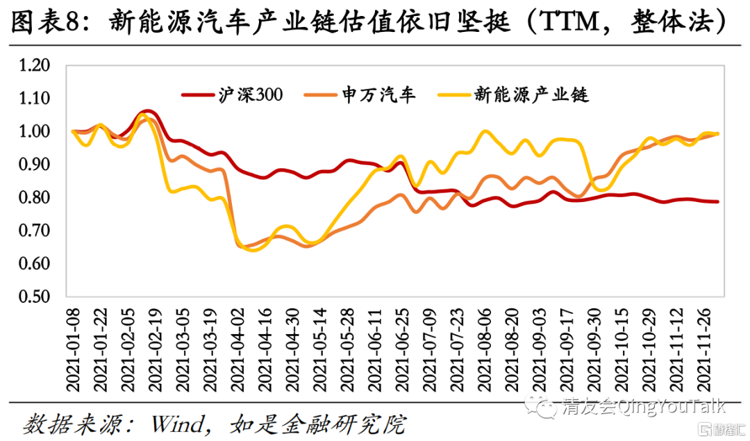 新能源汽车板块估值依然坚挺,下游整车估值抬升,上游锂电产业链估值略微消化。根据Wind数据沪深300、申万一级汽车分类、自建新能源产业链板块年内(2021年1月1日-2021年12月1日)滚动市盈率(整体法)涨跌幅分别为-21.27%、-0.59%、-0.82%,对应年末PE(TTM,整体法)分别为12倍、44倍、107倍,基本面回暖情况下,新能源汽车行业估值情况依然坚挺。分产业链看,下游(仅统计整车)、中游(电池、电机)、上游(正负极、隔膜、电解液)对应年内(2021年1月1日-2021年12月1日)滚动市盈率变(整体法)化分别为18.72%、-16.65%、-26.01%,对应年末PE(TTM,整体法)分别为115倍、170倍、73倍,下游整车企业估值抬升明显,中上游利润带动估值出现消化趋势。