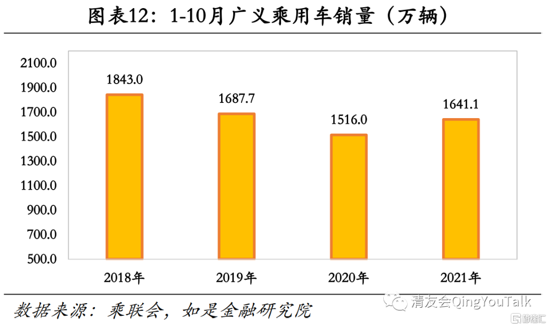 中、短期视角下,2018年乘用车销量基本封顶;年内汽车销售出现边际回暖迹象。从广义乘用车数据看,2018-2020年全年广义乘用车销量总计2273.9万辆、2101.5万辆、1959.0万辆,2018年乘用车销量封顶后市场萎缩明显。从高频数据来看,2021年一至十月广义乘用车累计销量1641.1万辆,已经超过疫情爆发后的2020年(1516.0万辆)总销量,略低于疫情前的2019年(1687.7万辆),汽车销售出现边际回暖迹象。