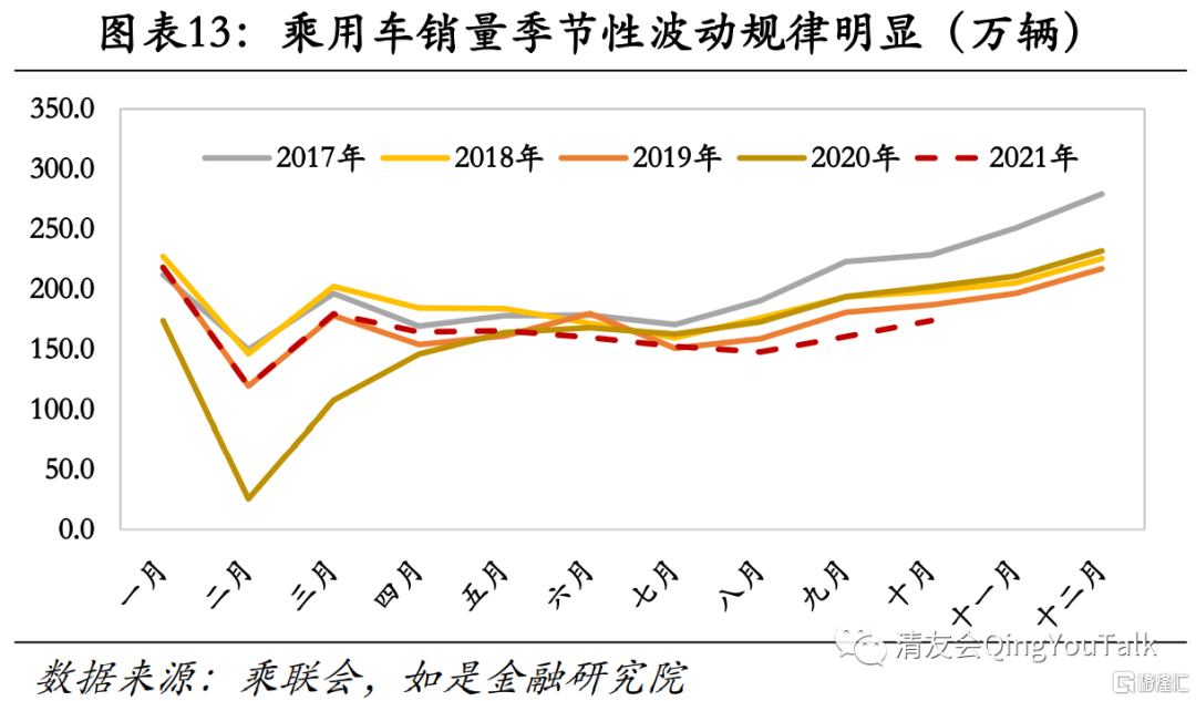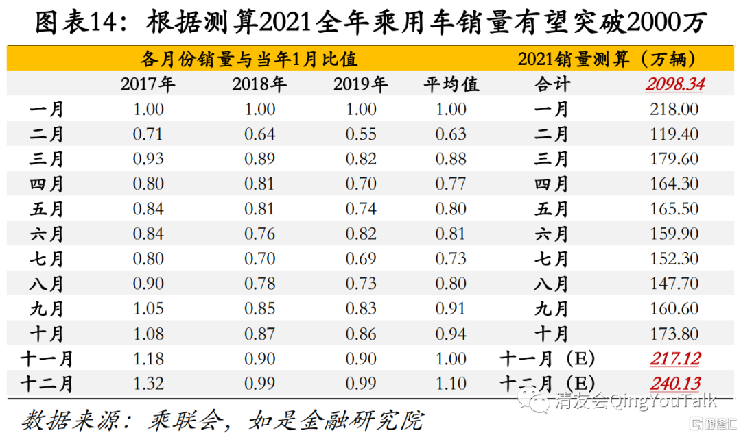 从季节性波动测算,2021全年广义乘用车销量或将达到2000万辆以上。一般情况下,全年汽车销量有季节性波动,一至四季度销量通常表现为“高-低-低-高”,三季度秋季车展期间汽车销售开始放量,年底经销商销售冲击业绩叠加消费者购车过年需求,四季度或一季度通常为一年销售高峰。由于全年汽车销量具有季节性波动特性,我们选取了疫情爆发前的三年为样本,将每年1月设置为基准,观察2017年1-12月、2018年1-12月、2019年1-12月三个完整年度样本。根据结果可以看出全年各月广义乘用车销量相对于每年1月的倍数确实具有较为明显的周期性波动,我们将三年样本求平均即可以得出汽车消量的季节性因子,并通过季节性因子测算11月与12月乘用车销量。根据测算2021全年广义乘用车销量有望达到2000万辆以上。