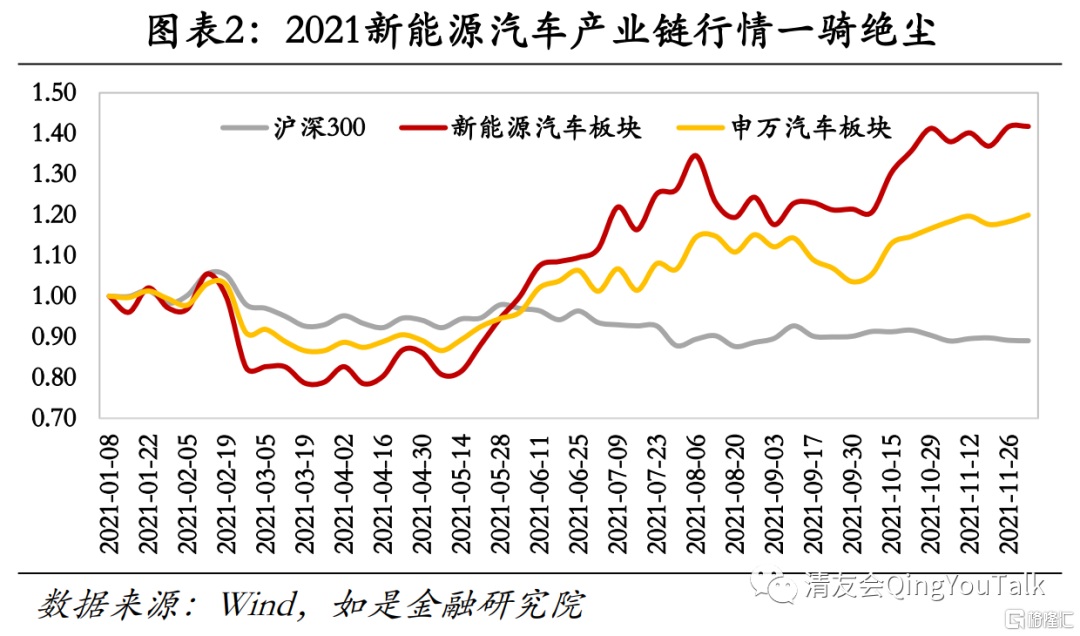 2021年新能源汽车产业链主要标的表现抢眼,行情在各板块中一骑绝尘。受益于汽车市场总体销量仍然稳固、新能源汽车市占率表现抢眼,带动新能源汽车产业链估值、利润双双抬升,推动板块行情一路上涨。从行情走势看年内(2021年1月1日到2021年12月1日)沪深300、申万汽车板块、新能源汽车产业链总市值加权平均涨幅分别为-10.96%、19.92%、41.72%;横向看新能源汽车产业链涨幅可位列申万一级分类中第3位置,仅次于电气设备(与新能源汽车产业链有高度重合)与有色金属(受年内大宗商品行情带动);涨幅排名前五板块分别为电气设备(50.1%)、有色金属(48.2%)、新能源(41.72%)、采掘(31.3%)、公用事业(30.0%)。