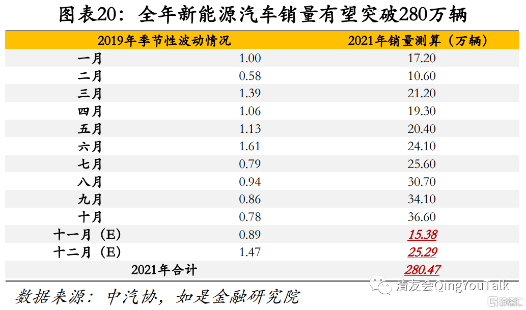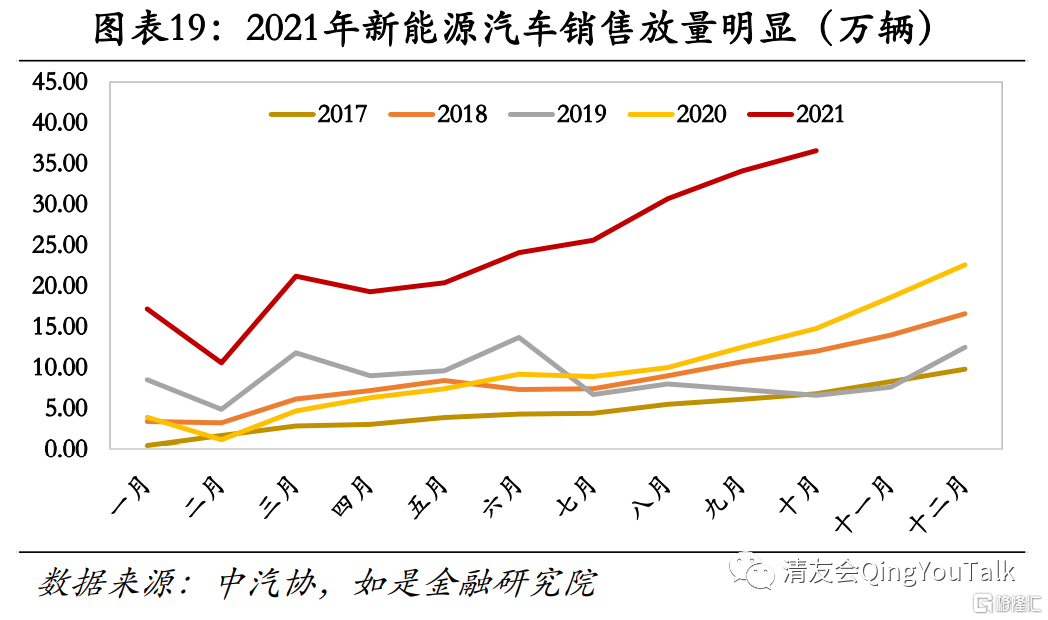 汽车消费总量虽然短期封顶,但新能源汽车市场火爆,单月新能源汽车渗透率逼近20%,全年销量有望超过280万。根据中汽协数据,2017年、2018年、2019年、2020年、2021年(1-10月)新能源汽车市场渗透率分别为2.31%、4.45%、4.95%、5.96%、14.23%;2021年8月、9月、10月新能源汽车市场渗透率分别为19.78%、19.47%、18.24%,单月新能源汽车渗透率逼近20%;根据测算,取疫情发生前的2019年数据为季节性波动基准,我们预计2021年全年新能源汽车销量有望超过280万辆。