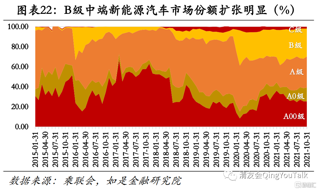 入门级、中端新能源车占据市场主导。从各级别新能源汽车市场份额上看,A级(紧凑型车)>B级(中型车)>A00级(微型车)>A0级(小型车)>C级(中大型车)。从趋势上看,近两年A00级(微型车)与B级(中型车)增长势头迅猛,与燃油车的高端、低端车销量“两极”高情况相悖。燃油车市场需求两极化主要来自于汽车消费在一、二线城市升级带动中高端汽车与豪华品牌销量上涨,汽车消费在农村普及带动低端、功能型乘用车市场份额猛增。而新能源汽车消费者多集中于充电基础设施配套较完善且有燃油车购车限制的一、二线城市,因此购车时功能化需求成为主要考量因素,带动A00级低价新能源汽车销量上升;同时由于市场主要厂商主导车型均集中于A级(紧凑型车)与 B级(中型车),电动车高端市场仍未大规模受高端消费者青睐认可,中端车占据市场主导。