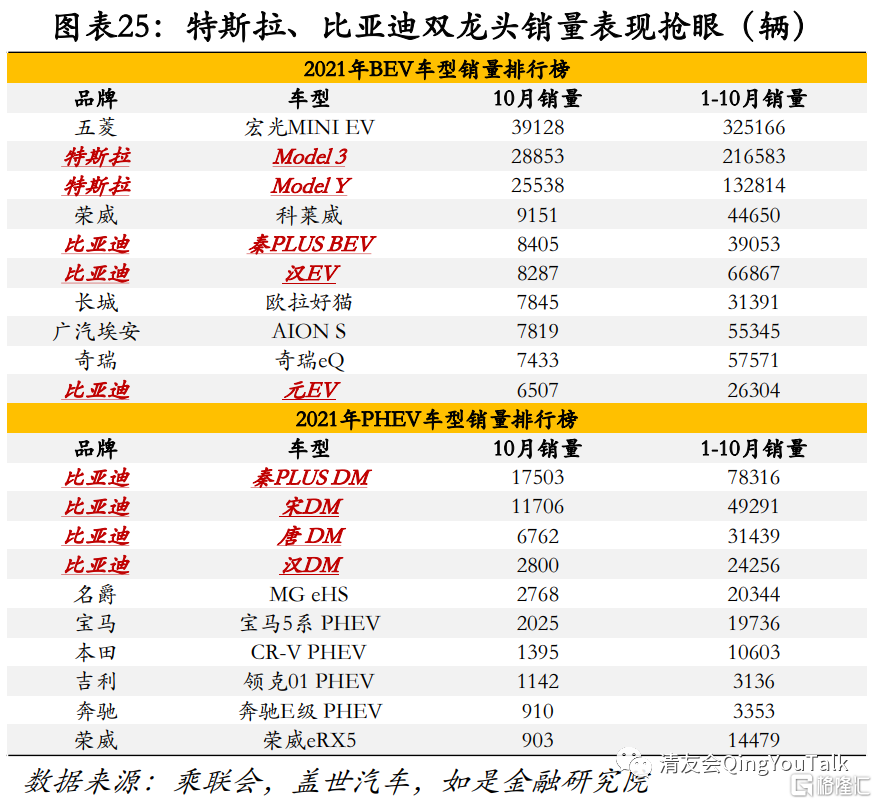 特斯拉地位依旧,比亚迪表现抢眼,二者占据市场主要份额。根据乘联会数据,2021年1-10月纯电动车(BEV)销量前五分别为五菱宏光MINI EV(325166辆)、特斯拉Model 3(216583辆)、特斯拉Model Y(132814辆)、比亚迪汉EV(66867辆),插电式混动车(PHEV)销量前五分别为比亚迪秦PLUS DM(78316辆)、比亚迪宋DM(49291辆)、比亚迪唐 DM(31439辆)、比亚迪汉DM(24256辆)、名爵MG eHS(20344辆)。