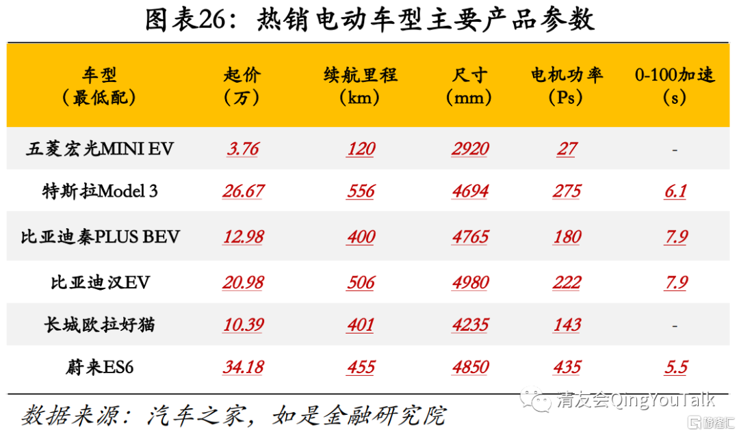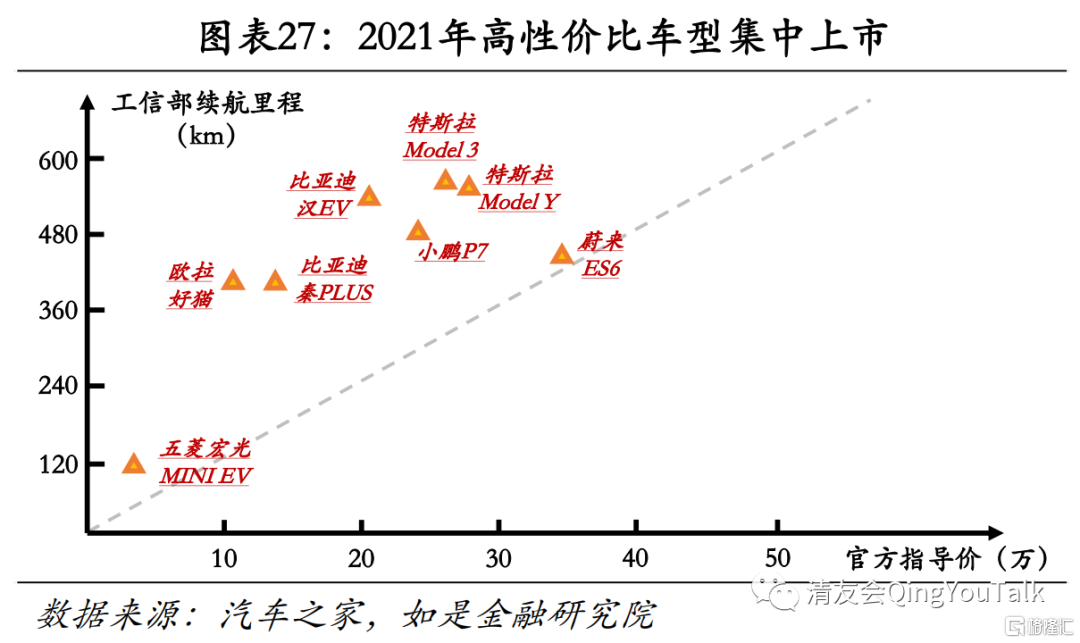 2021年为新能源汽车产品大年,低总价、高性能产品频出。优质车型集中登场从微观层面解释了2021年新能源汽车高渗透率现象。2021年市场主导产品五菱宏光MINI EV、特斯拉Model 3、比亚迪秦PLUS BEV等车型从标定续航里程角度看在相对低价的情况下续航里程较长、配置相对较高,更具性价比。