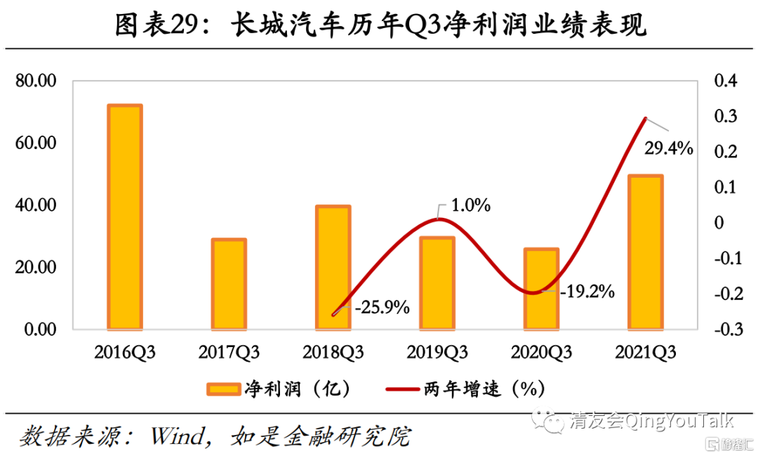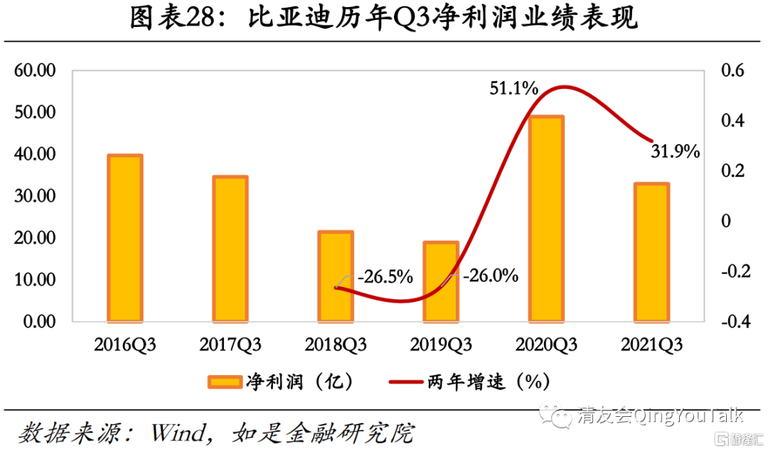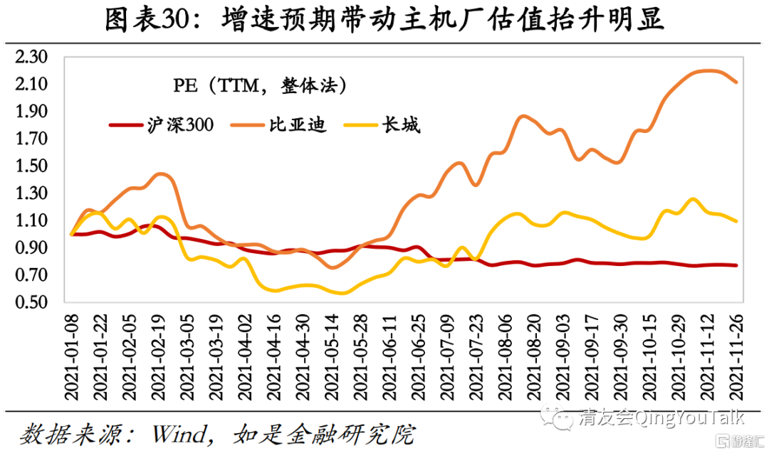主要厂商盈利能力修复情况良好,两年GAGR增速转正。以A股市场两主要新能源汽车厂商比亚迪(主要产品汉EV、秦PLUS BEV)、长城汽车(主要产品欧拉好猫)为例,比亚迪2019年-2021年Q1-3业绩分别为18.95亿元(两年GAGR-26.0%)、49.02亿元(两年GAGR51.1%)、32.97亿元(两年GAGR31.9%),长城汽车业绩分别为29.51亿元(两年GAGR1.0%)、25.87亿元(两年GAGR-19.2%)、49.45亿元(两年GAGR29.4%)。新能源汽车市场转向需求驱动,后疫情时期受益于乘用车消费需求反弹,两大国产厂商剔除疫情低基数高读数效应净利润两年GAGR转正,增速预期同时带动相关主机厂估值抬升明显,实现估值业绩双增。