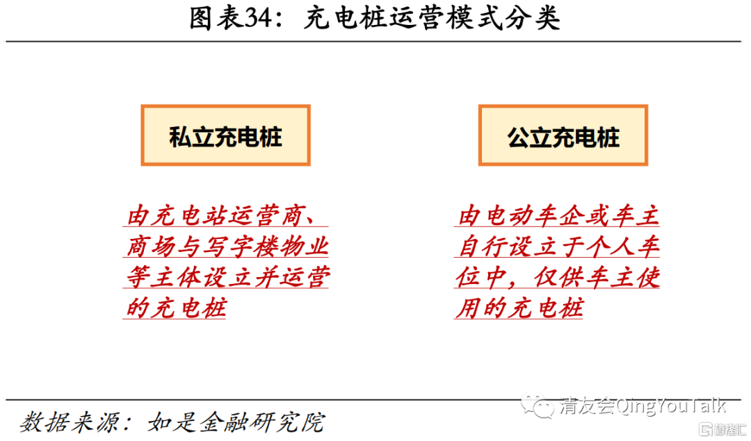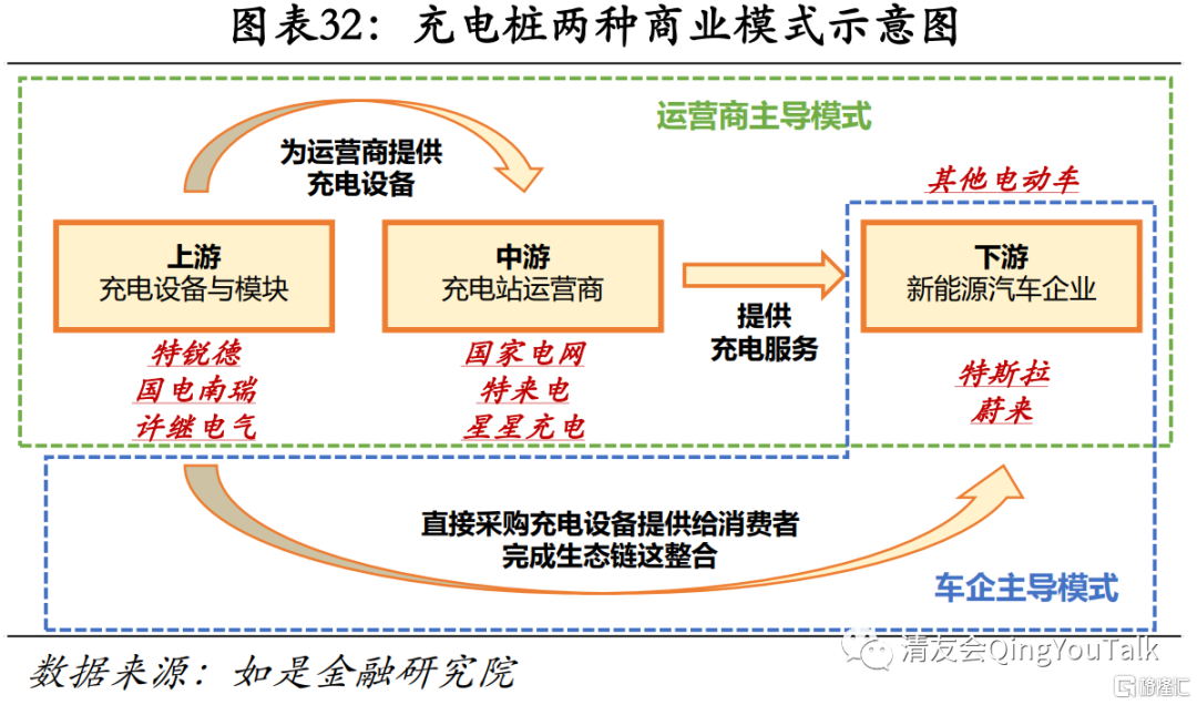 车企主导私立桩模式与运营商主导加电站模式同跑,私立桩市场份额占优。从产业链上看,充电桩产业链上、中、下游环节与其对应模式分别如下:上游——特锐德、国电南瑞、许继电气等充电设备与模块供应商;中游——特来电(特锐德子公司)、国家电网、星星充电等充电站运营商,向上游厂商采购充电设备,收取下游新能源汽车充电费用;下游——各大新能源车企,汽车用户可以从中游充电站运营商处充电,车企也可以通过向上游设备供应商处采购充电设备提供给汽车用户。从具体商业模式看,涉及充电桩赛道商业模式可分为两类,一是运营商主导模式,比如国家电网与特来电等公司,通过采购充电设备向汽车用户提供充电服务赚取费用;二是车企主导模式,比如特斯拉、蔚来通过向购车用户提供充电桩设立服务,该模式对车企来说不直接产生收入,但可以协助车企完成生态链整合,提高整体服务质量与用户体验。