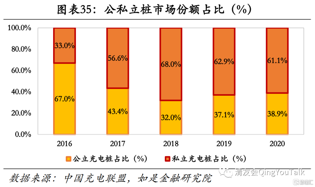 我国充电桩建设总量与新能源汽车保有高度相关,已经出现放量趋势。在总规模上,国内充电桩建设总量已经超过250万台。根据中国充电联盟统计数据,2016年、2017年、2018年、2019年、2020年、2021(10月)年我国充电桩建设总量分别为20.4万台、44.6万台、77.7万台、122.3万台、167.2万台、225.3万台,充电桩建设总量随2021新能源汽车放量明显。从结构上看,私立充电桩份额明显增加。充电桩可以根据运营主体分为公立充电桩(由充电站运营商、商场与写字楼物业等主体设立并运营的充电桩)和私立充电桩(由电动车企或车主自行设立于个人车位中,仅供车主使用的充电桩)。根据充电联盟数据,私立充电桩份额(私立充电桩建设数量/公立与私立充电桩总量)由2016年的33.0%增加至2020的61.1%,私立桩份额明显增加。从具体市场格局来看,以公立充电桩为例,当前充电站运营商市场规模前三位分别为星星充电(238597台)、特来电(232121台)、国家电网(196484台),头部效应明显。