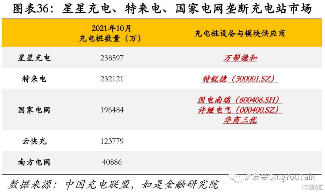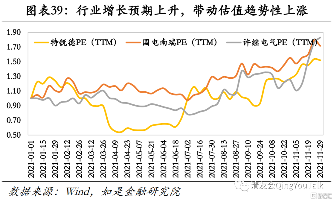 从资本市场表现来看,随新能源汽车带动充电桩市场需求走高,主要相关标的估值、业绩双增。从盈利能力看,充电桩产业链涉及主要标的受新能源汽车渗透率提升带动,净利润仍保持一定增速,国电南瑞、许继电气2021Q3对应净利润同比增长分别为24.0%、19.2%;特锐德受制于旗下充电桩运营商特来电市场份额遭星星充电、国家电网挤兑,前期充电桩铺量成本提升,2021Q3净利润同比-65.3%,但随充电桩前期成本回收叠加充电站高行业景气度,盈利能力有望收窄止跌。从资本市场估值来看,特锐德、国电南瑞、许继电气截至11月末年内PE(TTM)涨幅分别达52%、72%、83%,行业增长预期上升,带动估值趋势性上涨。