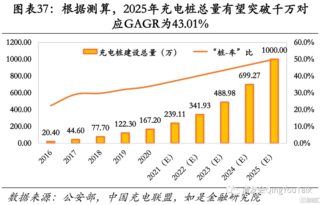 从“桩-车”比测算市场空间,保守估计未来5年充电桩市场有5倍以上空间。2015年国务院办公厅下发的《电动汽车充电基础设施发展指南(2015-2020年)》规划到2020年底“桩-车”比达1:1,但这一数值如今尚未实现(仅为约34%)。采取保守估计,假设到2025年新能源汽车保有量为2000万辆,2025年“桩-车”比为50%,依此测算到2025年充电桩建设总量可达千万台以上,对应GAGR为43.01%。
