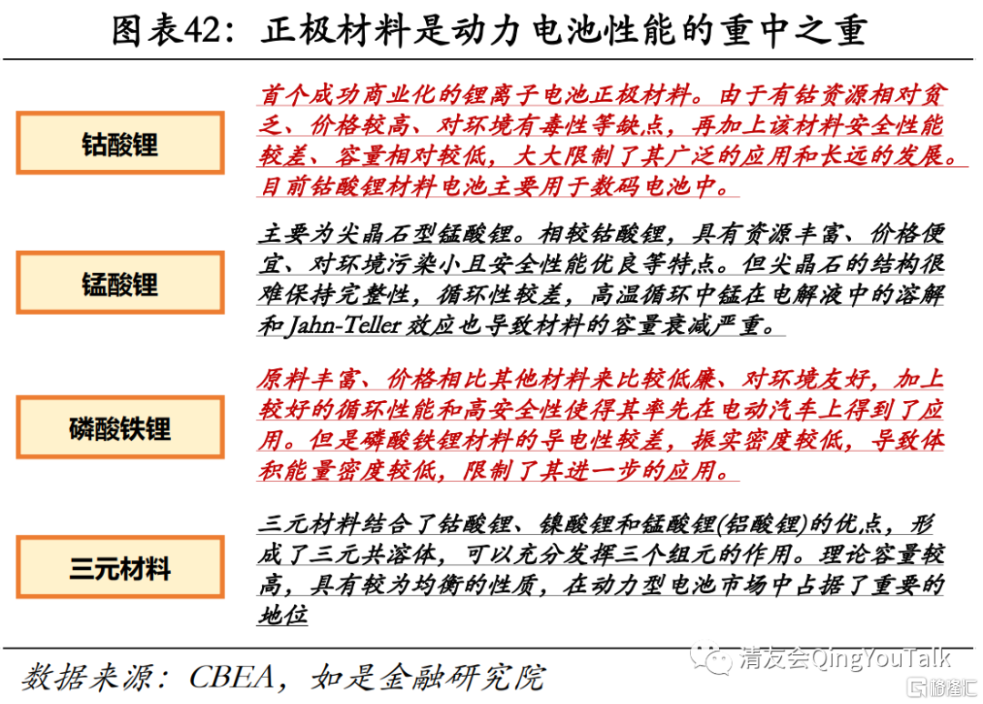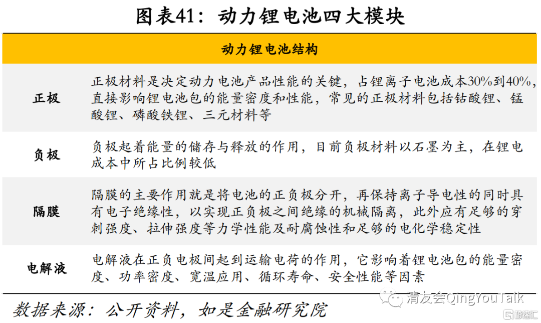 正极材料是区分动力电池产品性能核心要素。我们常见的二次锂电池主要依靠锂离子在正负极之间的往返嵌入和脱嵌来实现能量的存储和释放。从组成结构上来看,锂离子电池主要由四大部分组成:一是正极,正极材料是决定动力电池产品性能的关键,占锂离子电池成本30%到40%(GGII数据),直接影响锂电池包的能量密度和性能,常见的正极材料包括钴酸锂、锰酸锂、磷酸铁锂、三元材料等;二是负极,负极起着能量的储存与释放的作用,目前负极材料以石墨为主,在锂电成本中所占比例相对较低,技术壁垒略低于正极;三是隔膜,隔膜的主要作用就是将电池的正负极分开,在保持离子导电性的同时具有电子绝缘性,以实现正负极之间绝缘的机械隔离;四是电解液,电解液在正负电极间起到运输电荷的作用,它影响着锂电池包的能量密度、功率密度、宽温应用、循环寿命、安全性能等因素。