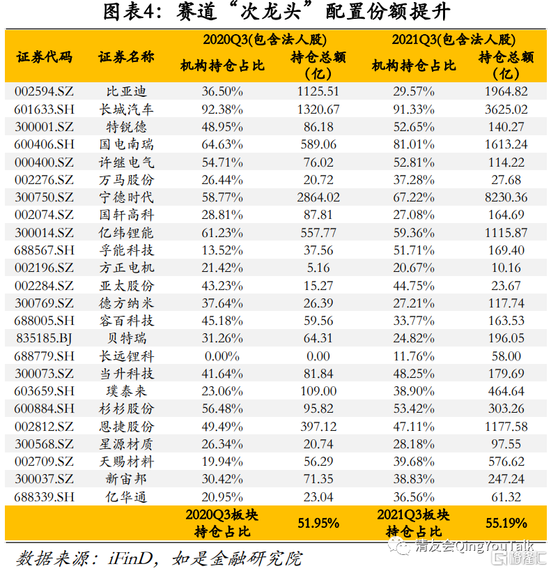 部分赛道投资机会缩窄,“次龙头”配置份额提升。新能源汽车板块整体机构持仓集中度提升,细分赛道头部标的受机构青睐,但从风向看机构增配主力已经从第一龙头过度至“次龙头”,从一定程度上说明部分赛道投资机会缩窄。从机构持仓情况看(含法人股)2021Q3与2020Q3相比万马股份(+10.84%)、当升科技(+6.61%)、璞泰来(+15.84%)、天赐材料(+19.75%)、新宙邦(+8.41%)等充电桩、正负极材料、电解液“次龙头”获机构增配。